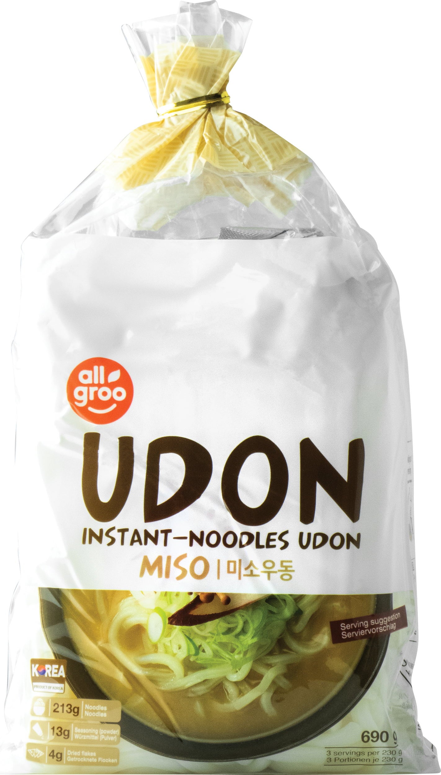 Udon-instantnudlar med misosmak från allgroo bjuder på en extra aromatisk upplevelse och passar perfekt till udon-nudelsoppor med djup umamismak.