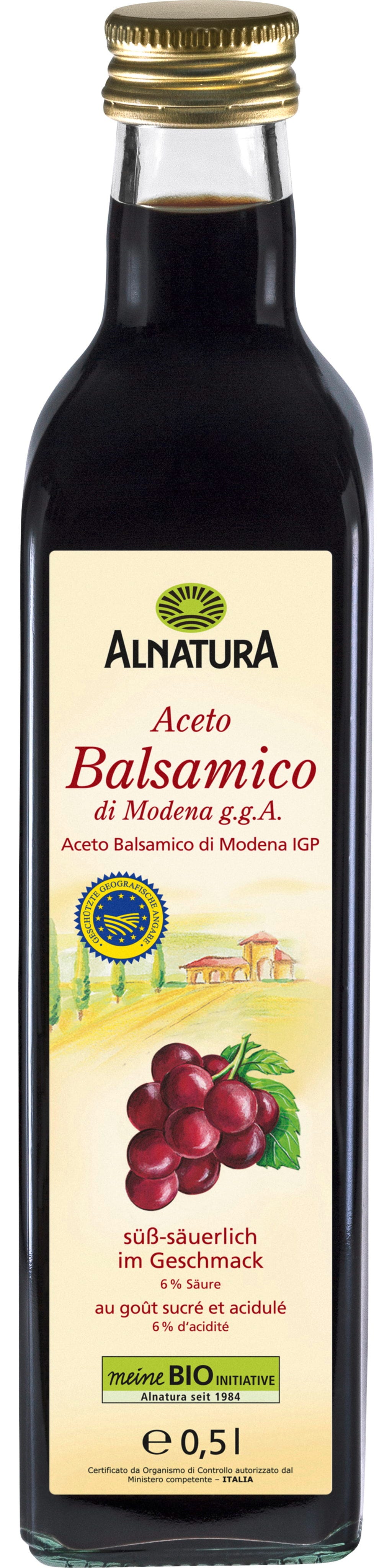 Bio Aceto Balsamico di Modena g.g.A. från Alnatura har lagrats i träfat. Blandningen av rödvinsvinäger och koncentrerad druvmust ger en söt och syrlig smak. Vinägern passar utmärkt till antipasti, grönsaks- och kötträtter samt sallader. Den är även mycket god till jordgubbar och desserter.