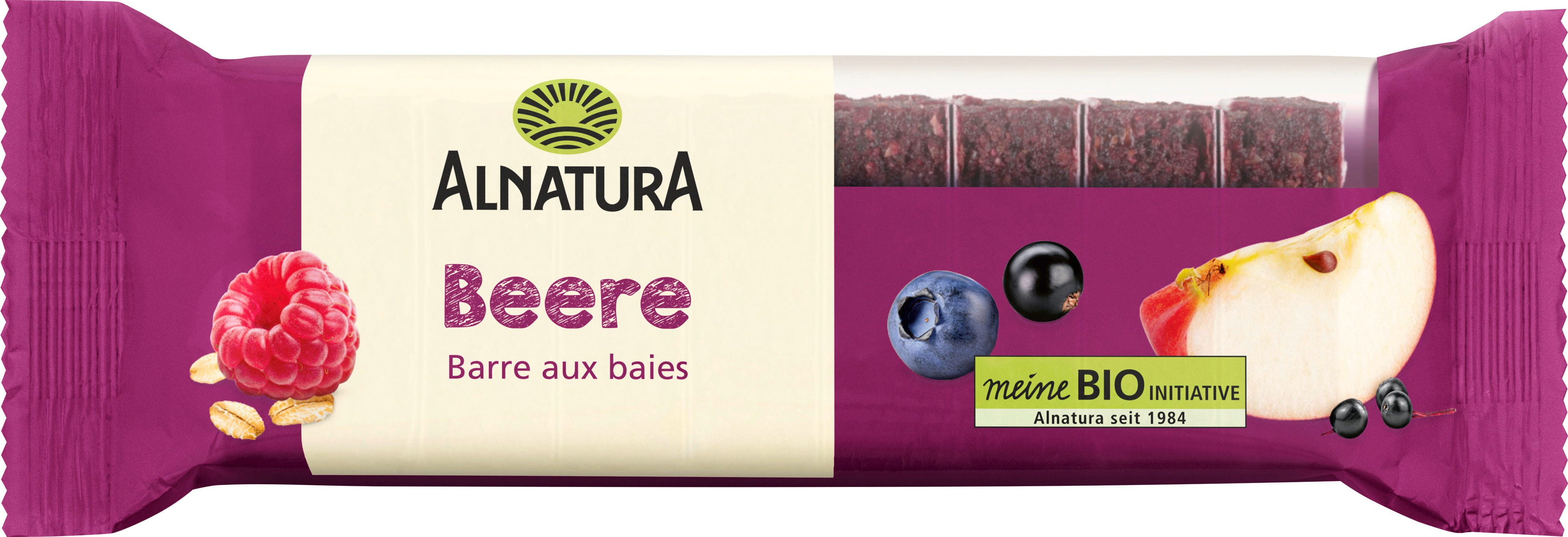 Alnatura ekologisk bär- och fruktbar kombinerar äpplen, bär och havreflingor. Baren är uppdelad i lagom stora bitar. Den passar perfekt som mellanmål eller att ta med, eftersom oblatet runt om skyddar mot kladdiga fingrar.