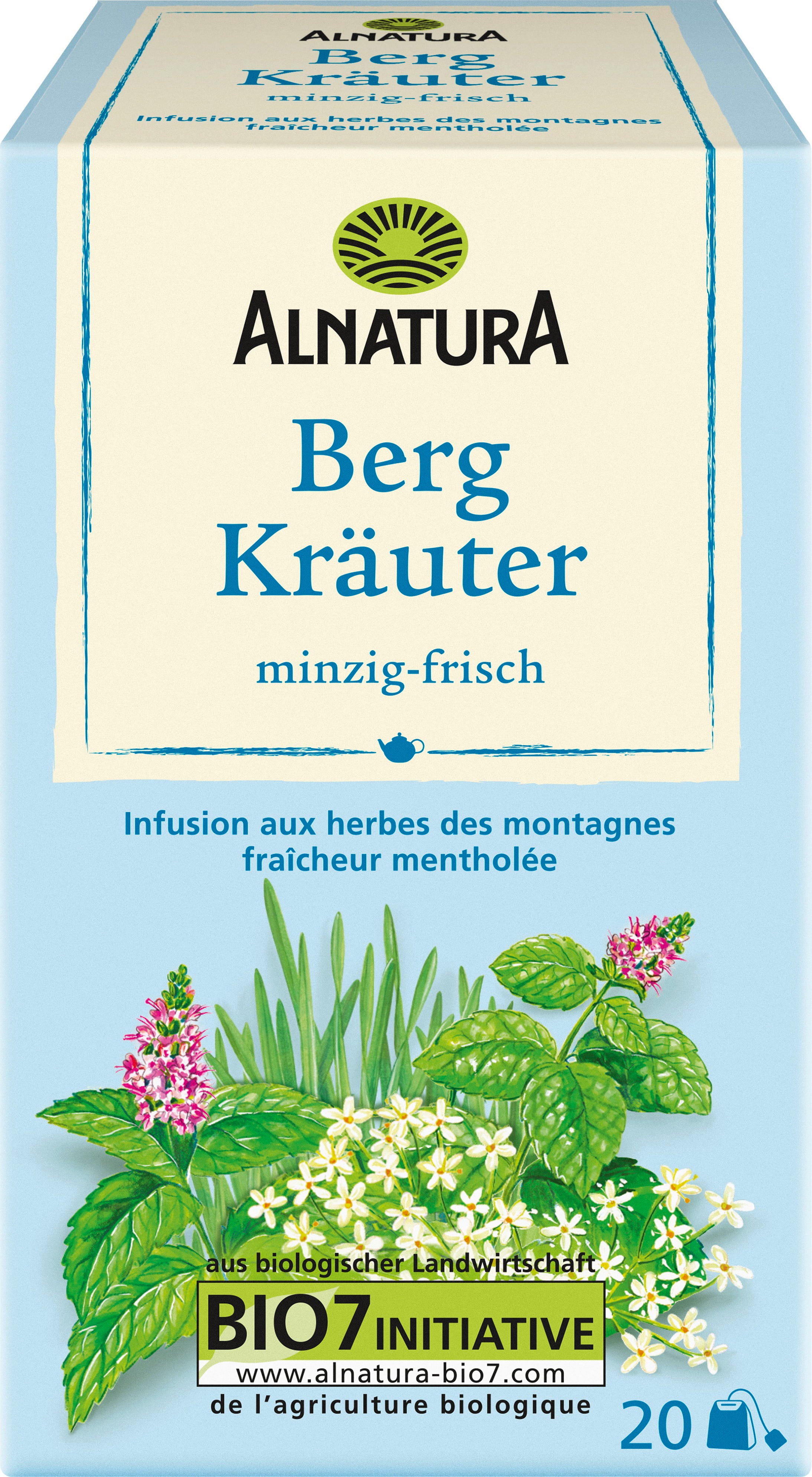 Utvalda bergsörter som havreört, citronmeliss, pepparmynta och rölleka kombineras i ett te: Alnatura ekologiskt bergsörtste. Med sin friskt mintiga smak passar teet utmärkt som daglig dryck. Ingredienserna kommer från ekologiskt jordbruk.
