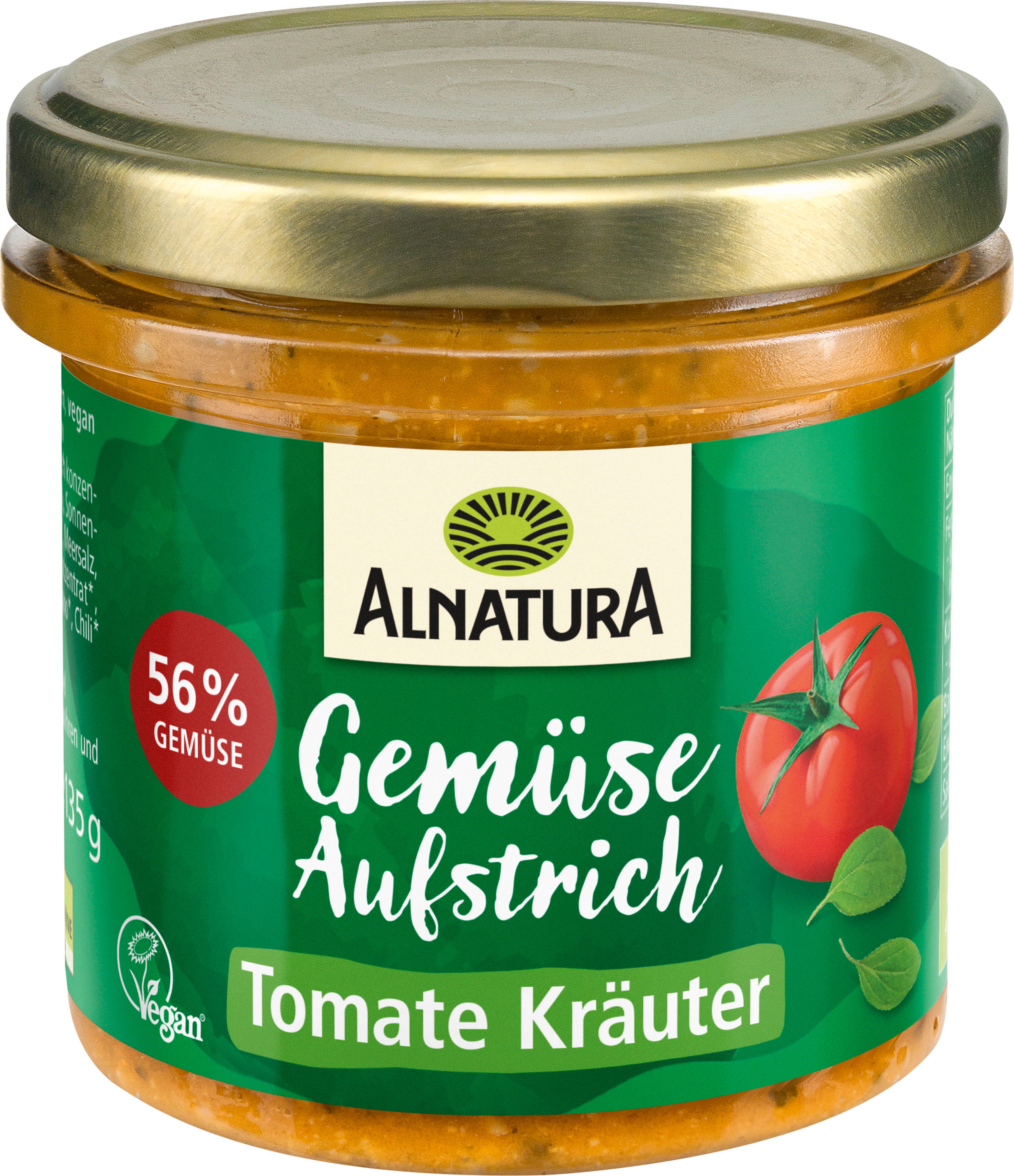 Fruktigt aromatiska tomater utgör basen i Alnatura ekologiskt pålägg trädgårdsgrönsaker: tomat och örter. Tillsammans med lök, basilika och oregano skapas ett veganskt och harmoniskt pålägg med medelhavskaraktär. Passar inte bara på bröd utan även i olika maträtter.