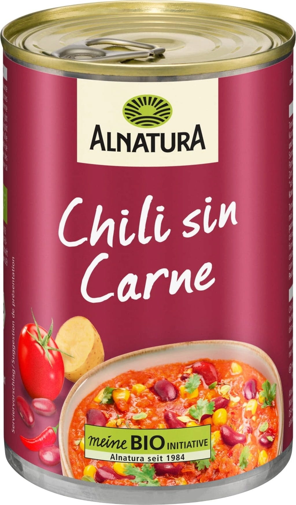 Alnatura chili sin carne är en vegansk, kryddig gryta med tomater, kidneybönor, sojafärs och mer. Utvalda örter och kryddor ger den sin pikant aromatiska smak. Chili sin carne värms enkelt i kastrull och är snabbt klar.