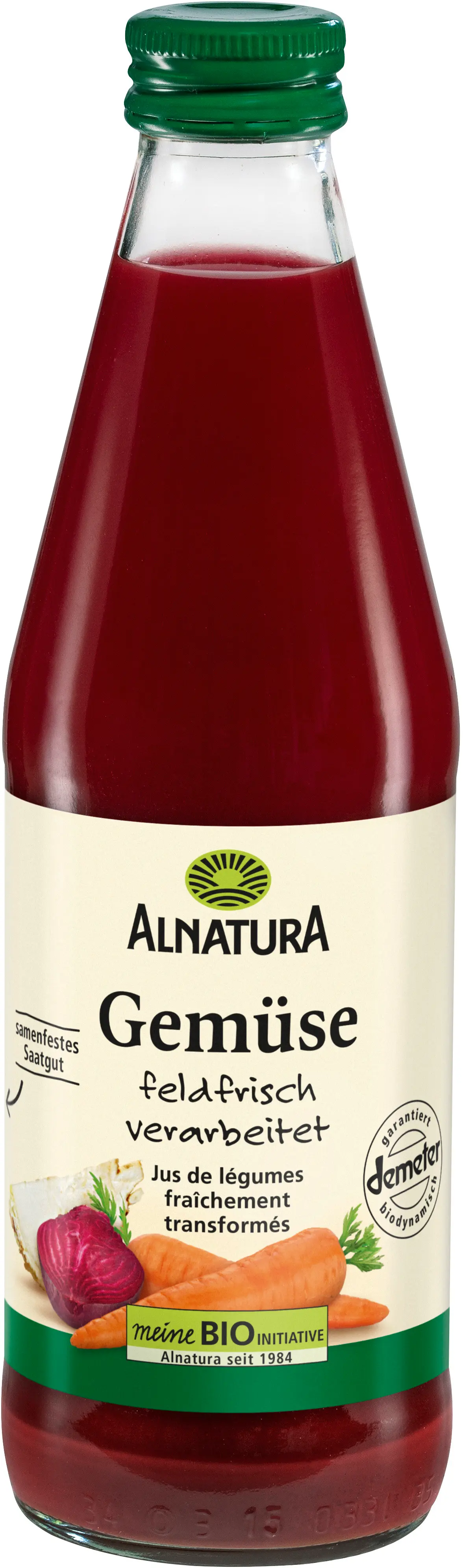Njut av den ekologiska grönsaksjuicen från Alnatura pure eller använd den som bas för soppor och såser. Juicen får sin aromatiska smak från morötter, selleri och rödbetor, som bearbetas färska från fältet och balanseras harmoniskt med acerola och citronsaft.