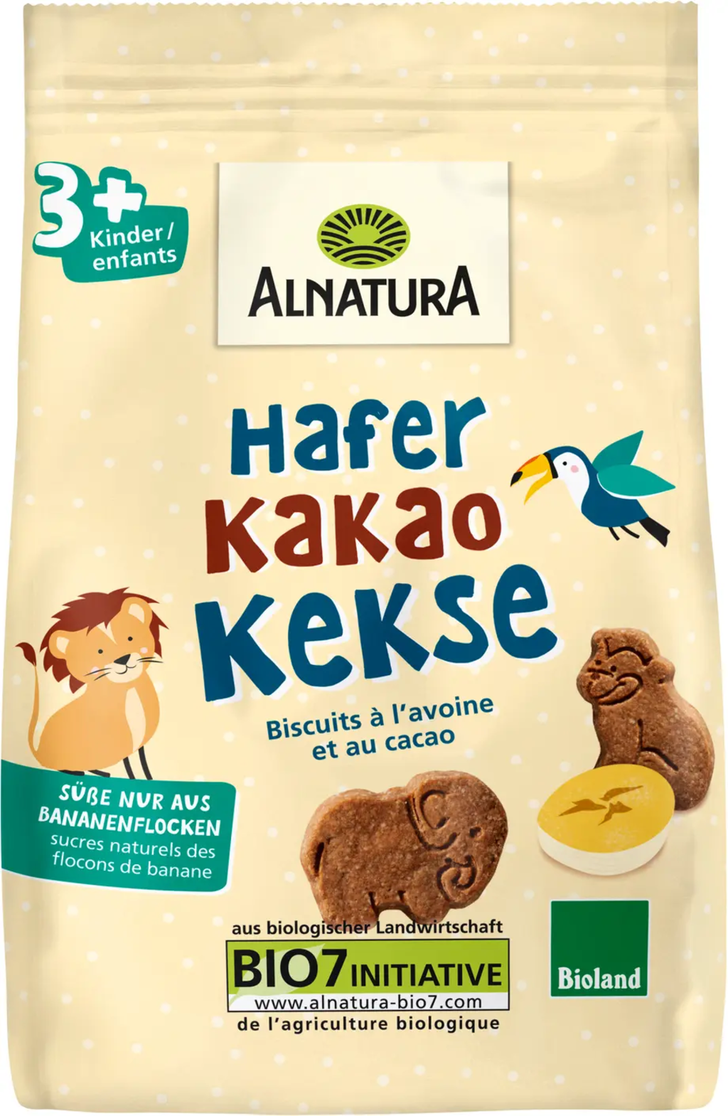 Helhavremjöl, bananflingor och kakaopulver ger de här kakorna i en rolig djurform med massor av smak! Kakorna är lämpliga för barn från 3 år och uppåt - ett utmärkt mellanmål mellan måltiderna och på språng. Alnatura tillsätter inget socker i detta recept; alla ingredienser är av bästa ekologiska kvalitet.