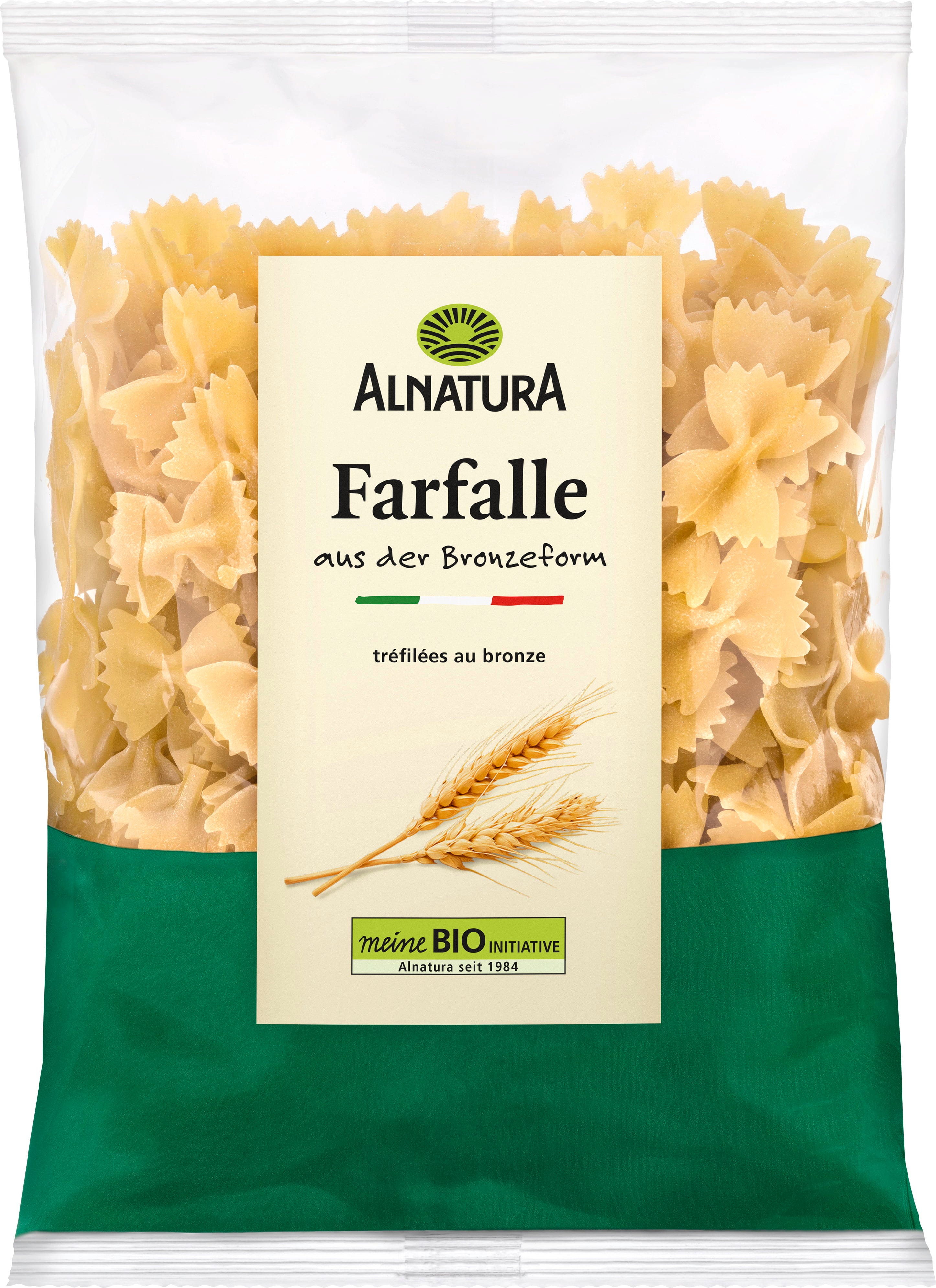 Pastasorten farfalle (på svenska ”fjäril”) är en klassiker. Alnatura ekologiska farfalle tillverkas i Italien av 100 % italienskt durumvete och pressas traditionellt genom bronsformar. Det ger pastan en särskilt grov yta så att såser fäster extra bra.