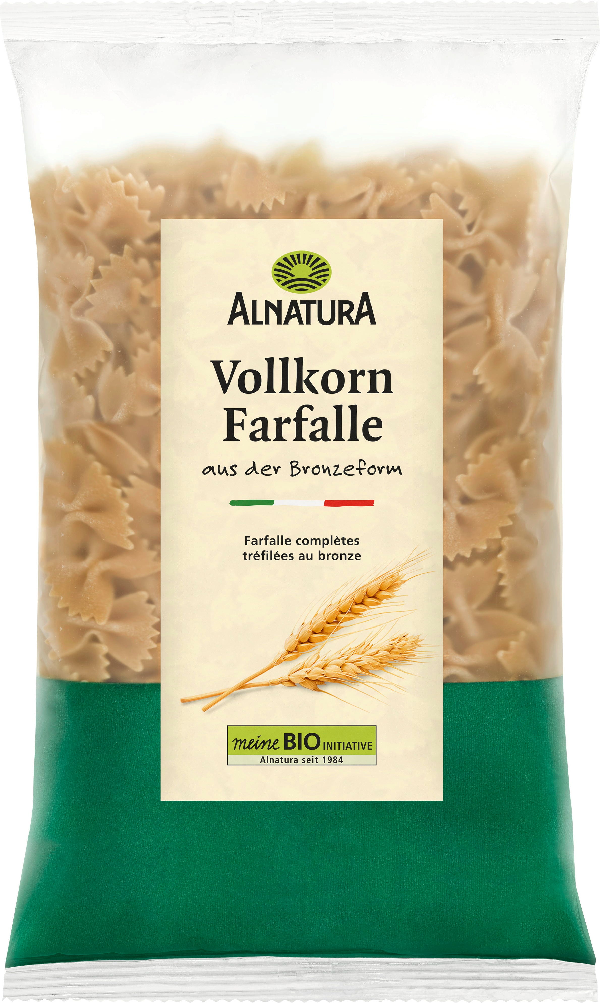 Ekologisk fullkornsfarfalle från Alnatura tillverkas av fullkorns durumvete. Pastan har en fyllig smak och passar därför utmärkt till fruktiga och kryddiga såser.