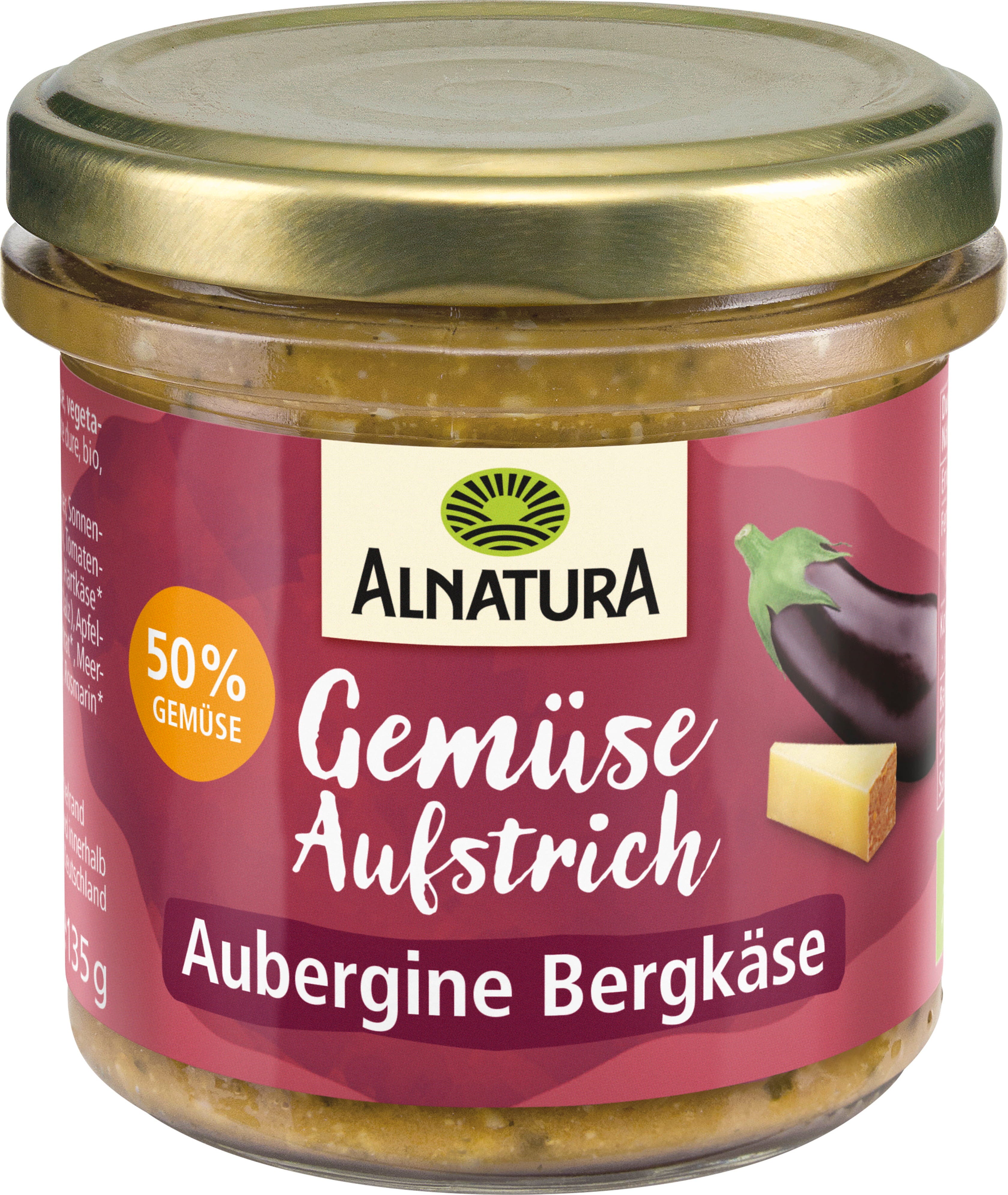 Det vegetariska Alnatura ekologiska grönsakspålägget består till 50 % av grönsaker: aubergine, zucchini, tomater och lök utgör basen. Pålägget förfinas med bergost och kryddor för det lilla extra. Passar utmärkt till bröd och frallor men även som dipp.
