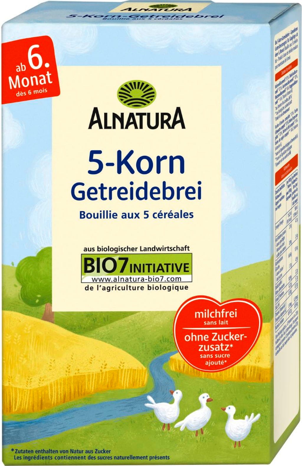 Fem olika ekologiska fullkornsmjöl i en och samma barngröt: Alnatura femkornsgröt består av havre, dinkel, korn, vete och råg - varav 66 % i Demeter-kvalitet. Gröten är fri från tillsatt mjölk och socker (ingredienserna innehåller naturligt socker).