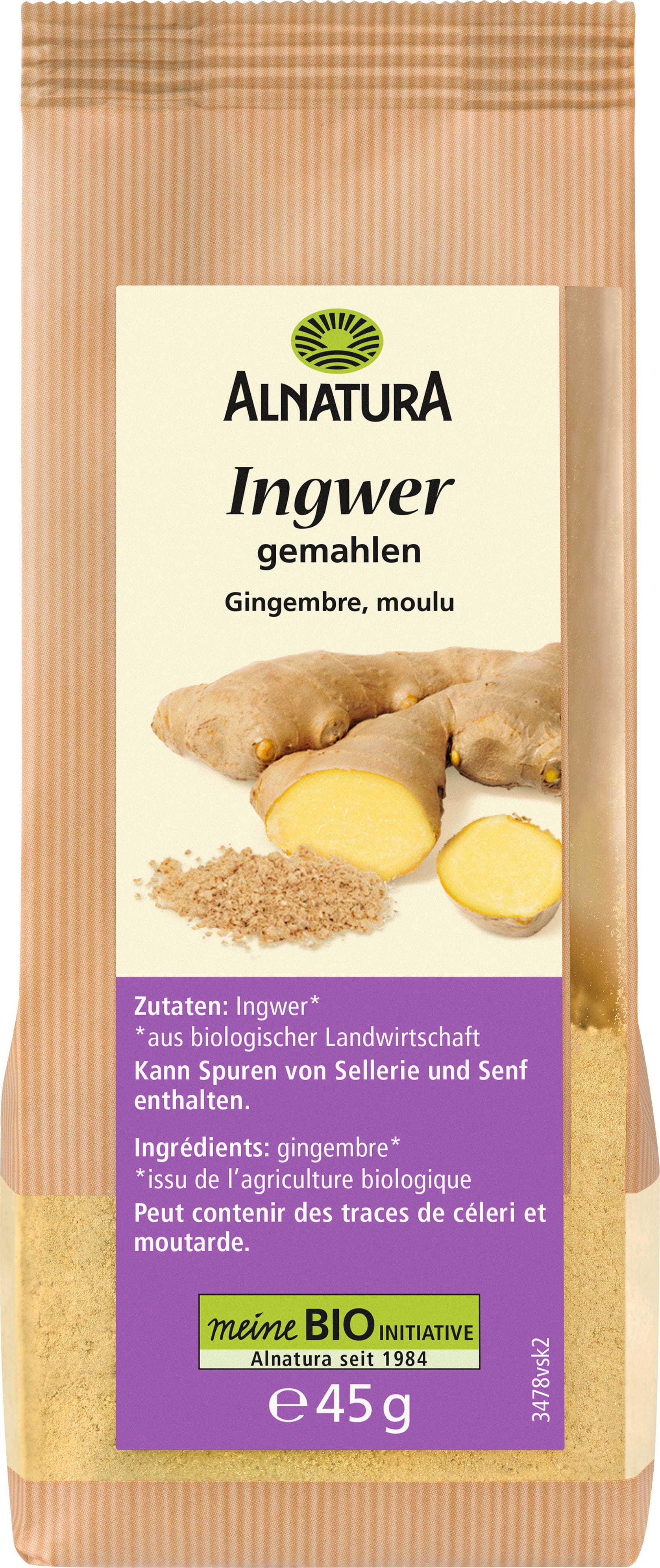 Alnatura ekologisk ingefära kommer från ekologiskt jordbruk och förpackas finmald.