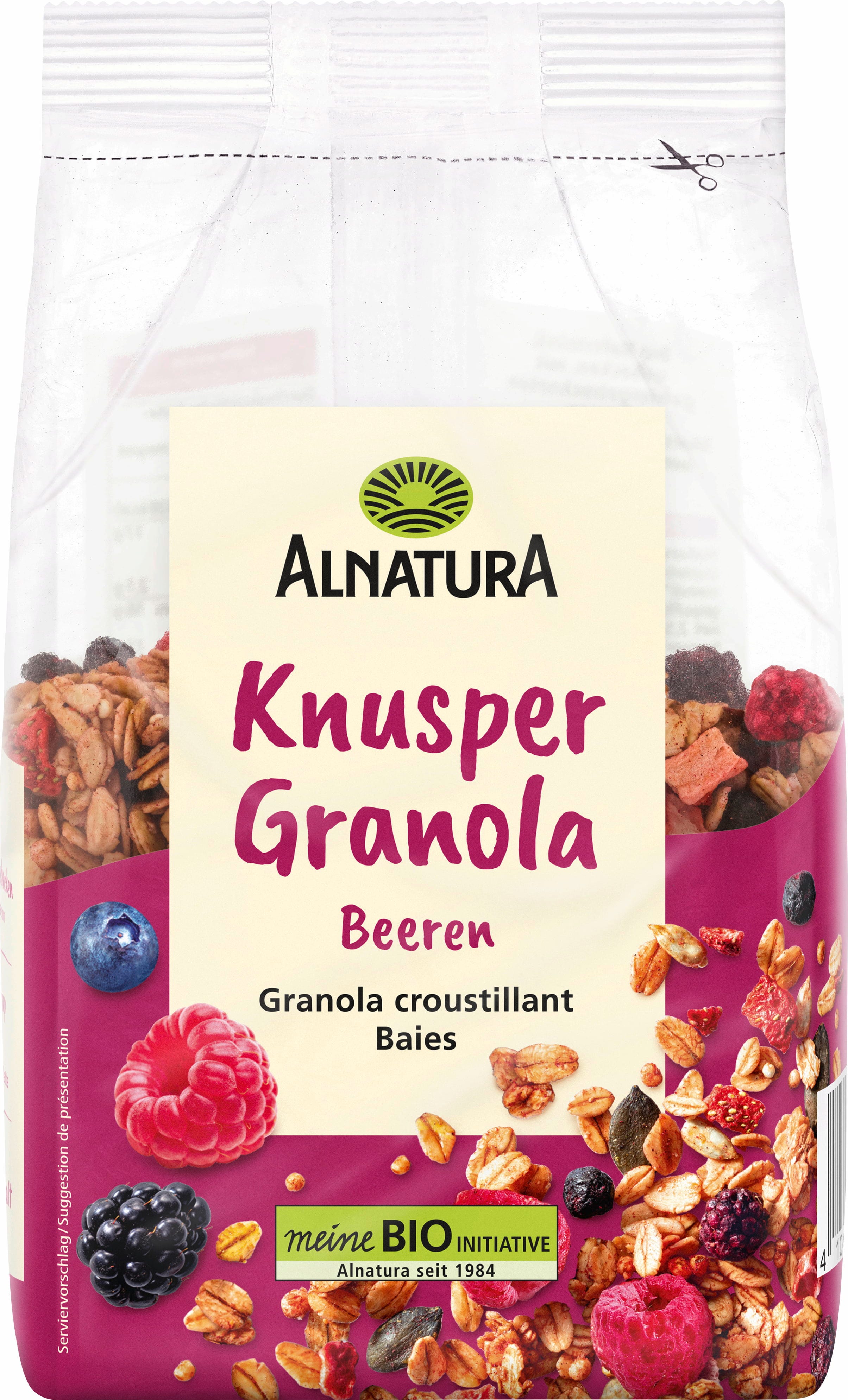 Med det veganska Alnatura ekologiska knusper granola bär får du en krispig upplevelse både till frukost och som mellanmål. Den höga andelen havreflingor kompletteras med frystorkade hallon, blåbär, jordgubbar och björnbär samt sötas med dadelsirap. Perfekt att njuta av med yoghurt, mjölk eller växtbaserade alternativ, som topping eller som ett sött snack. Alla ingredienser kommer från ekologiskt jordbruk.