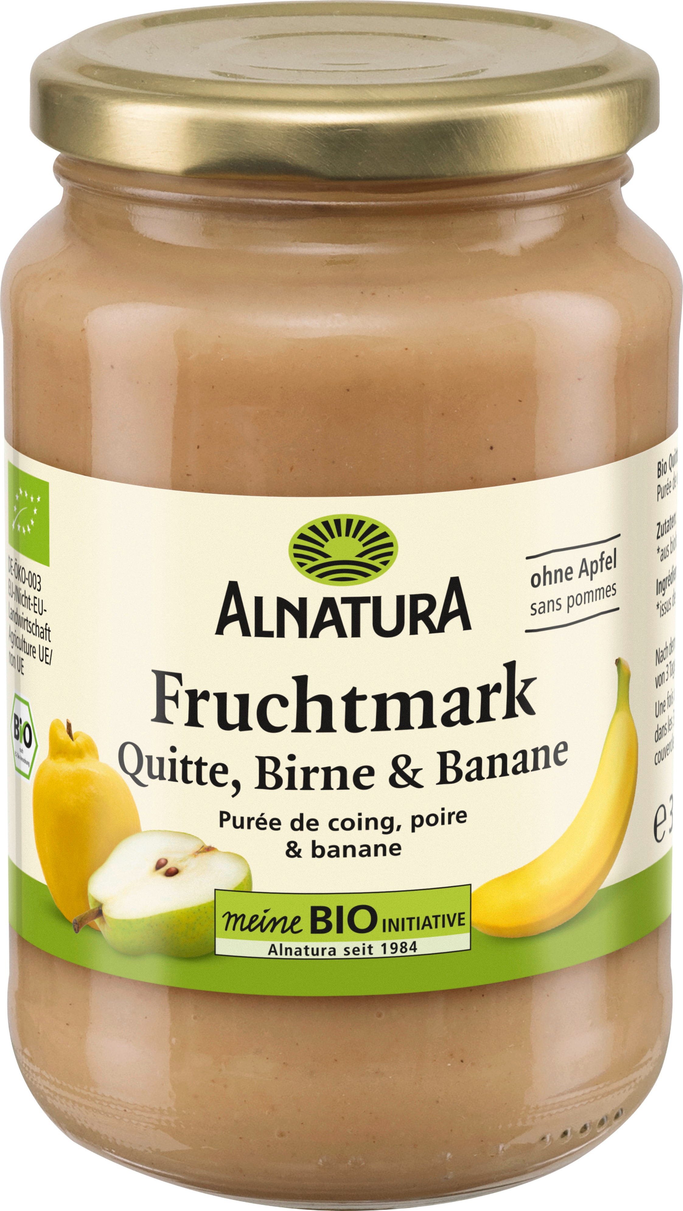 Alnatura ekologisk kvitten-päron-fruktpuré med banan imponerar med sin varierade smak. Purén tillverkas enbart av kvitten, päron och banan - det klassiska äpplet ingår inte. Den passar att njuta av som den är, som dessert, till risgrynsgröt och mycket mer.