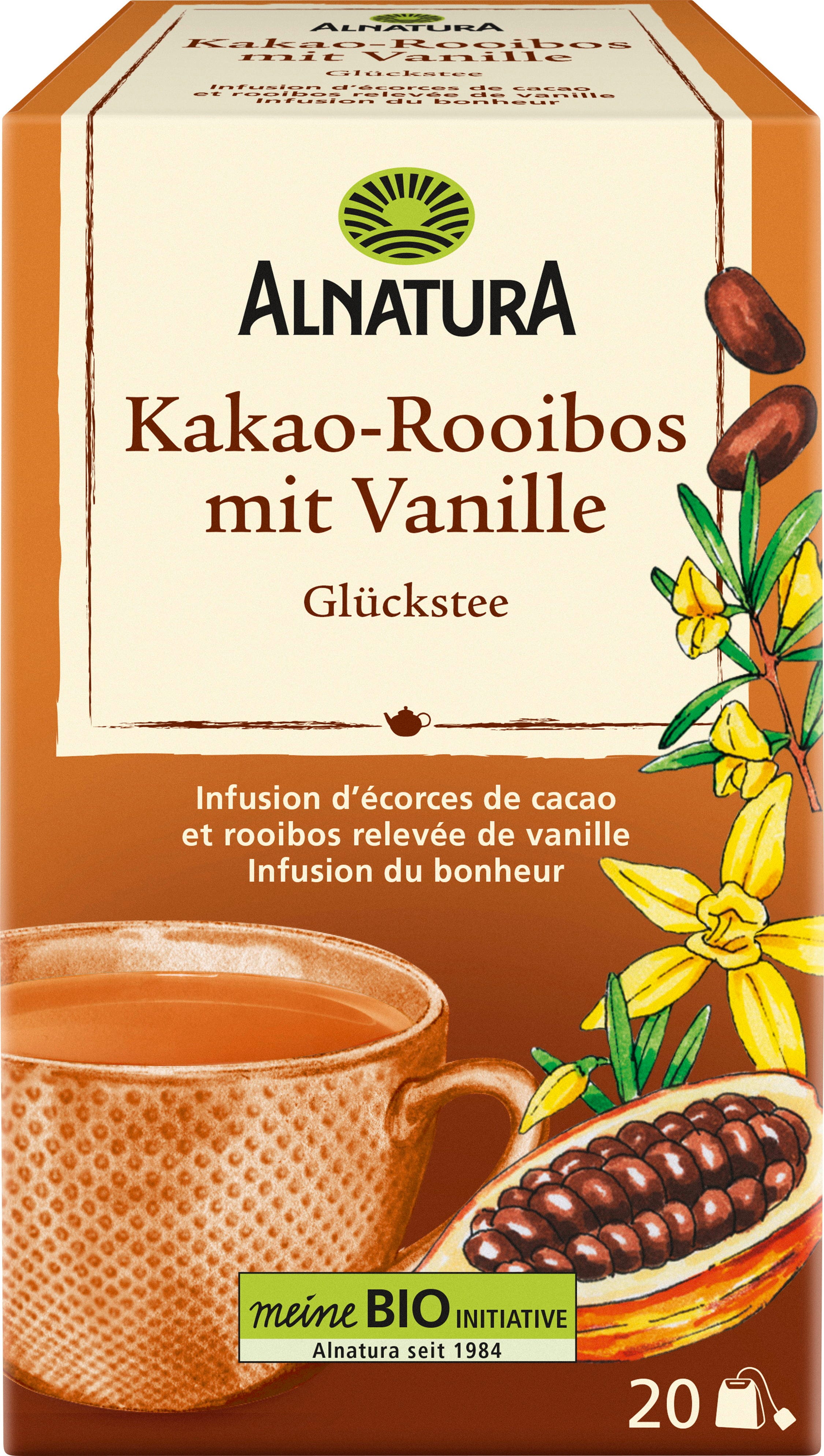 En söt och aromatisk kopp lycka: Alnatura ekologisk lyckote kakao rooibos med vanilj imponerar som en harmonisk teblandning. Förfinad med utvalda kryddor smakar den gott naturell eller till exempel med en skvätt mjölk eller en vegansk alternativ.