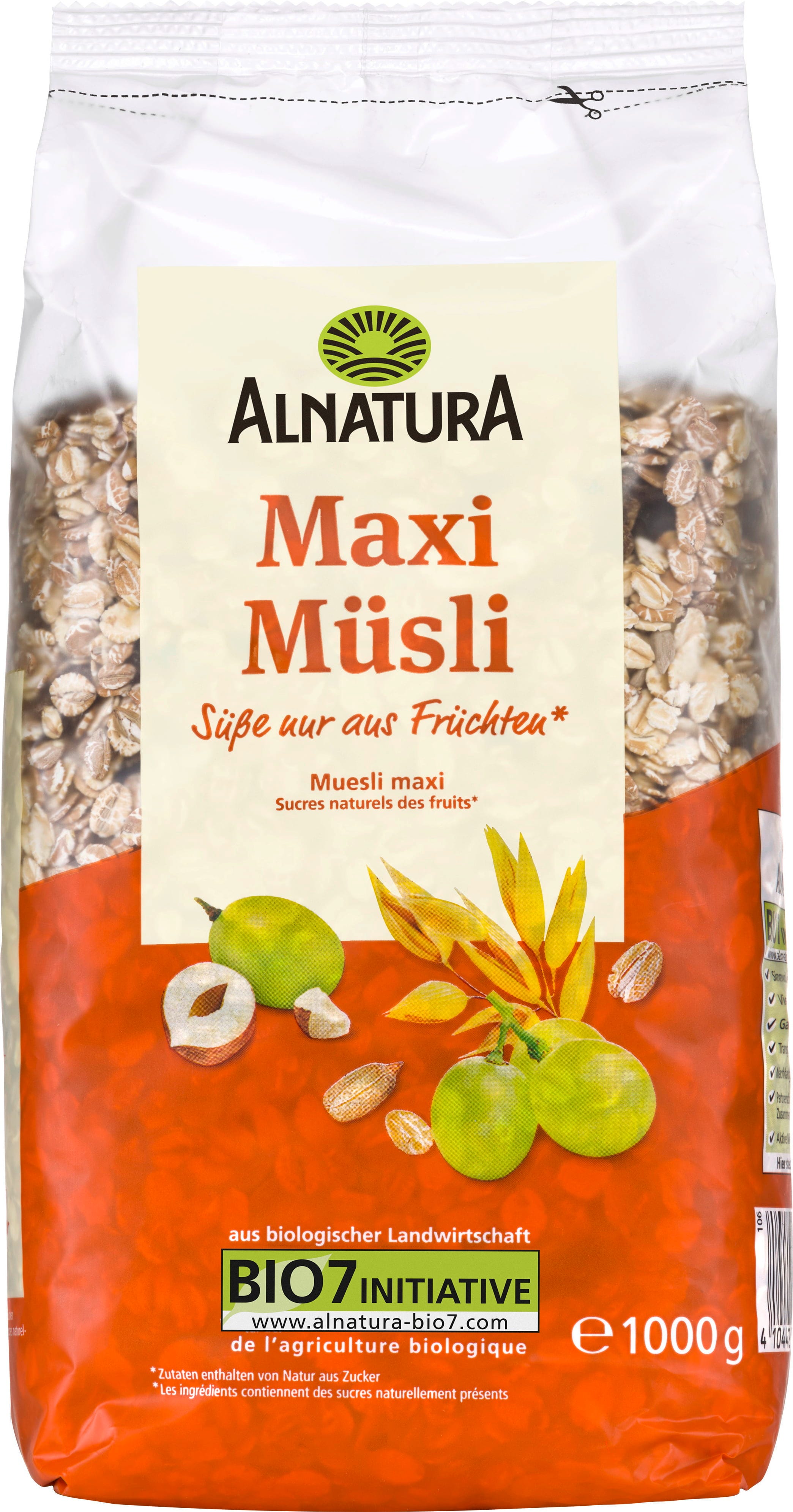 Alnatura ekologisk maxi-müsli kombinerar flera fullkornsflingor med sultanrussin och rostade hasselnötter. Den är fri från tillsatt socker. Müslin passar med mjölk, växtbaserade drycker eller yoghurt. För extra smak kan färsk frukt tillsättas.