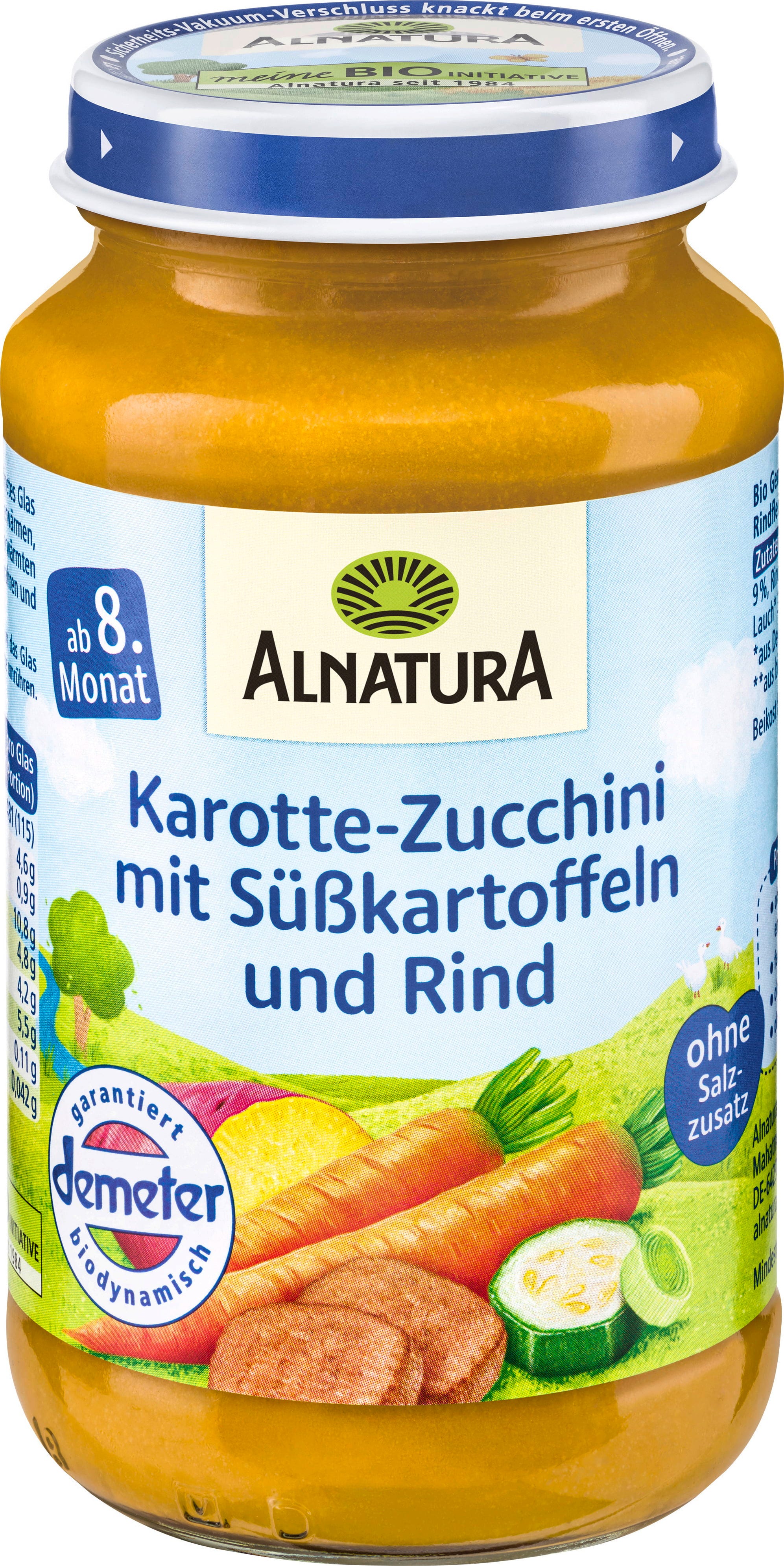 Babymaten Alnatura ekologisk morot-zucchini-sötpotatis med nötkött tillverkas i Demeter-kvalitet och utan tillsatt salt. De fina bitarna och konsistensen uppmuntrar barnet att tugga.