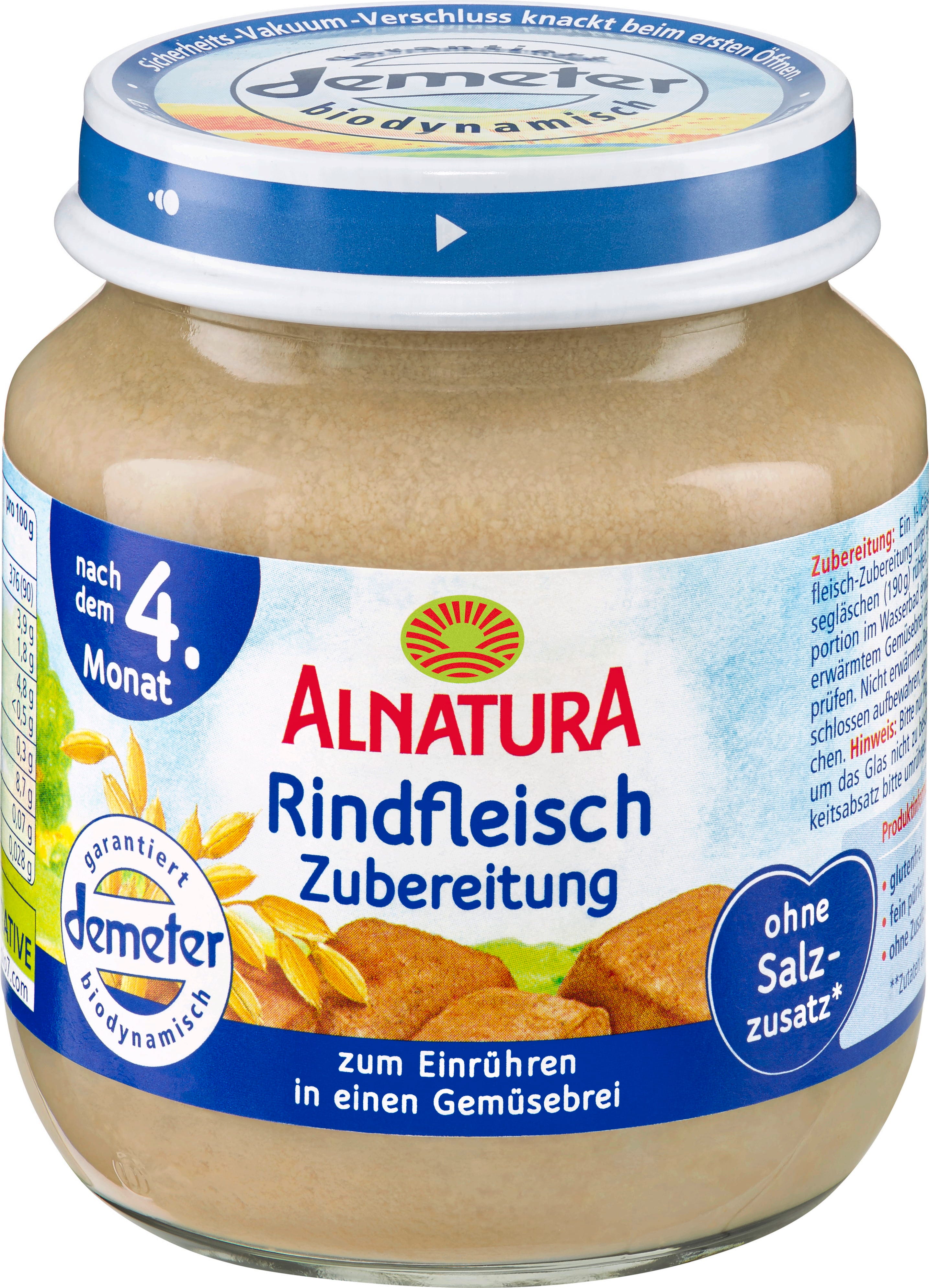 Den glutenfria barnmatsburken från Alnatura med nötkött är fint purerad. Produkten tillverkas utan tillsatt salt (ingredienserna innehåller naturligt salt) och är laktosfri. Blanda gärna halva burken med en halv burk grönsakspuré och värm i vattenbad.