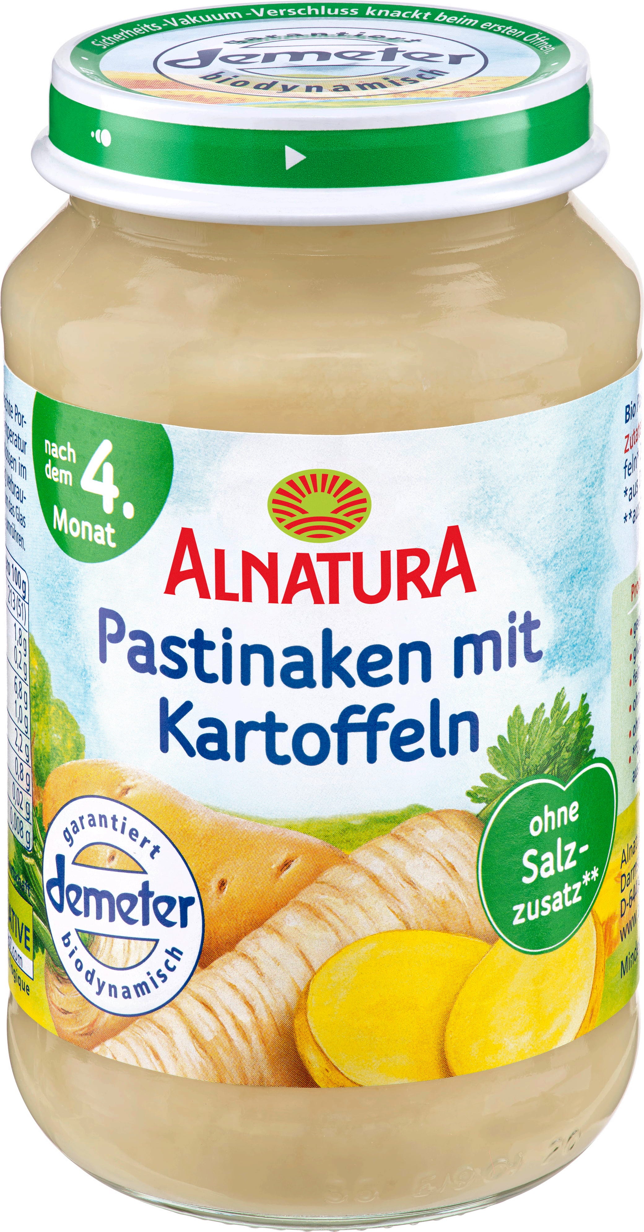 Alnatura ekologisk palsternacka med potatis passar bra som introduktion till fast föda. Ingredienserna i denna ekologiska grönsaksrätt är i Demeter-kvalitet, fint purerade och lämpliga från 5 månaders ålder. Glutenfri och utan tillsatt salt (ingredienserna innehåller naturligt salt).