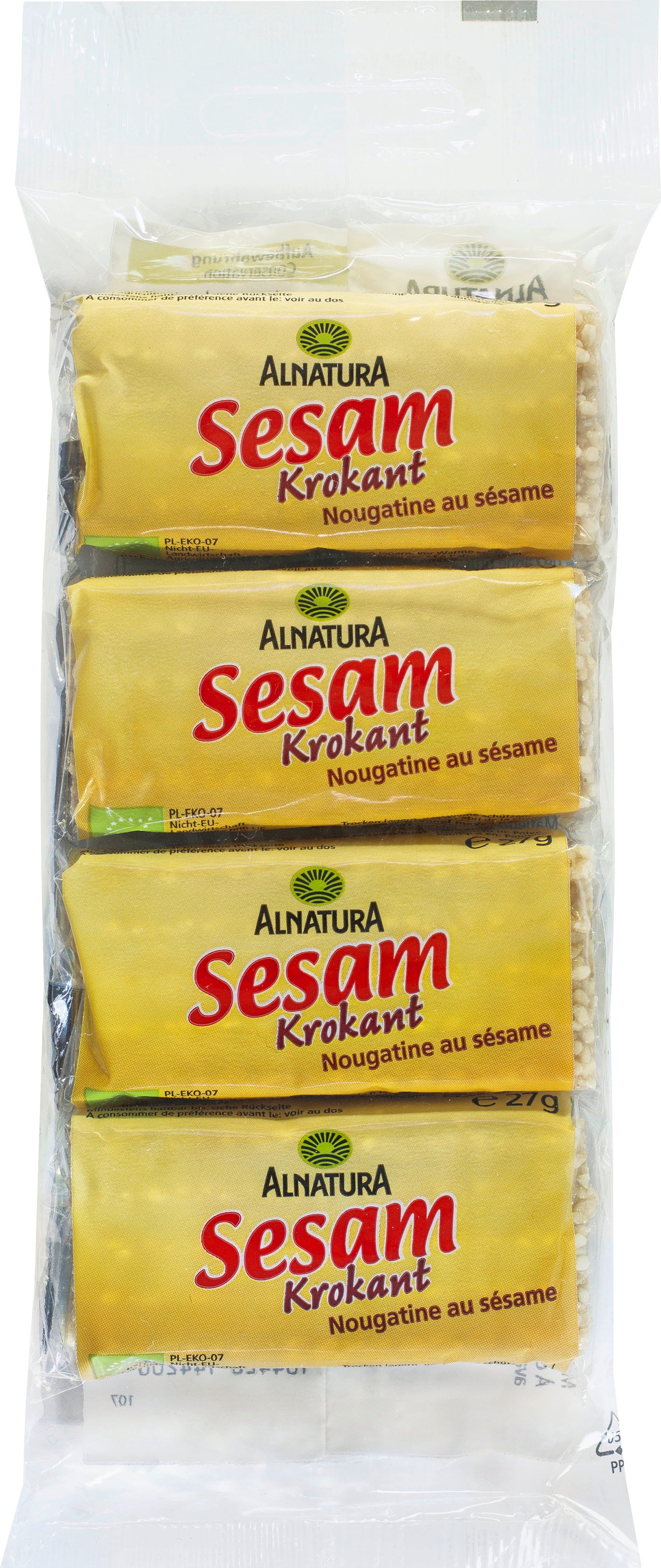 Ekologisk sesamkrokantbar från Alnatura kommer i ett praktiskt fyrpack. De fina bitarna består av gyllene rostad sesam och sirap. Barerna passar perfekt att ta med och som mellanmål. Tips: smula över glass eller desserter för extra smak.