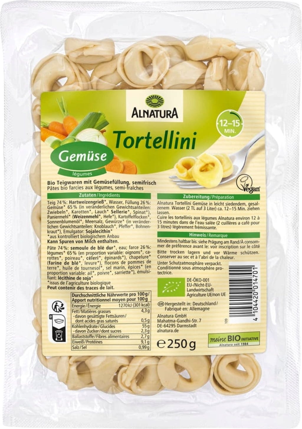 Alnatura tortellini med grönsaker smakar inte bara gott utan passar även perfekt för snabb matlagning. Degen består av endast två ingredienser: durumvetemjöl och vatten. Fyllningen innehåller en blandning av olika grönsaker.