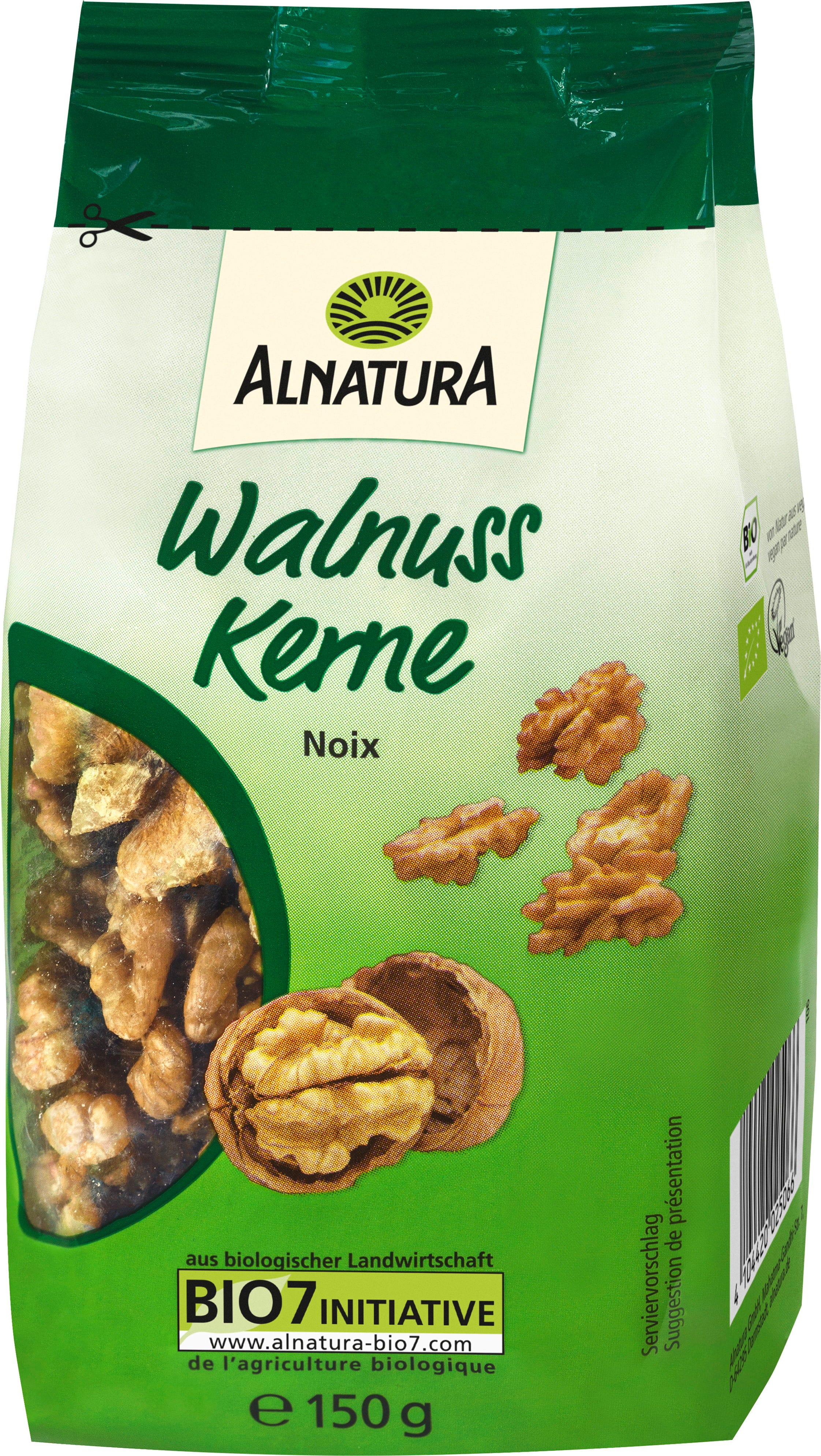 Ekologiska valnötskärnor från Alnatura har en söt och lätt besk smak. De är perfekta som mellanmål men kan också användas på många sätt. Passar lika bra i bakning som i müsli eller som tillbehör till ost och vin.