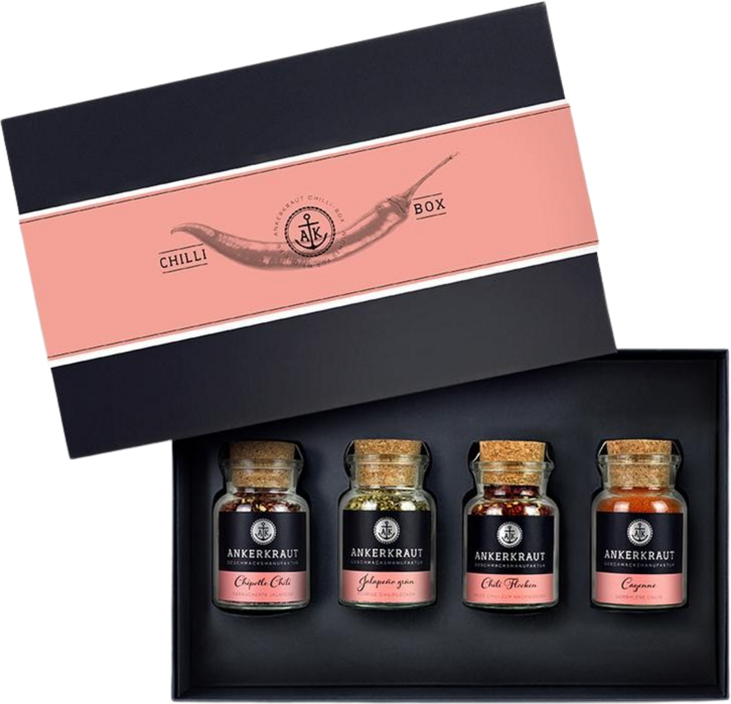 En riktigt eldig gåva: fyra chilispecialiteter i vackra korkburkar, förpackade i en elegant svart kartonglåda med original Ankerkraut-gåvobanderoll. Chili Selection innehåller 4 korkburkar med: