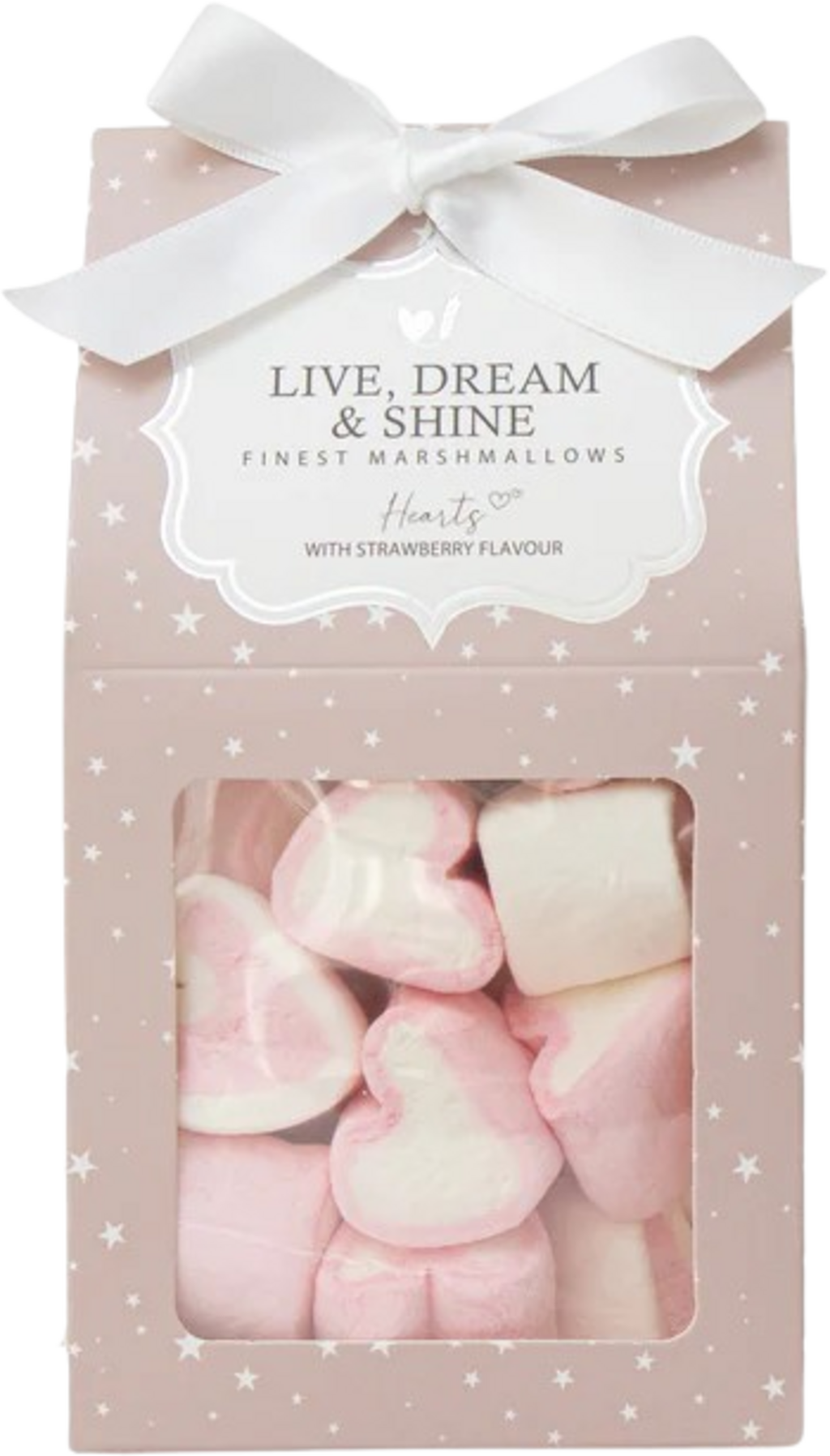 Luftiga, söta och med ett kärleksfullt budskap: Dessa rosa och vita marshmallowhjärtan med jordgubbssmak kombinerar mjuk njutning med en inspirerande design. Perfekta som liten gåva, till snacks eller som topping på varm choklad, tårtor och mer.