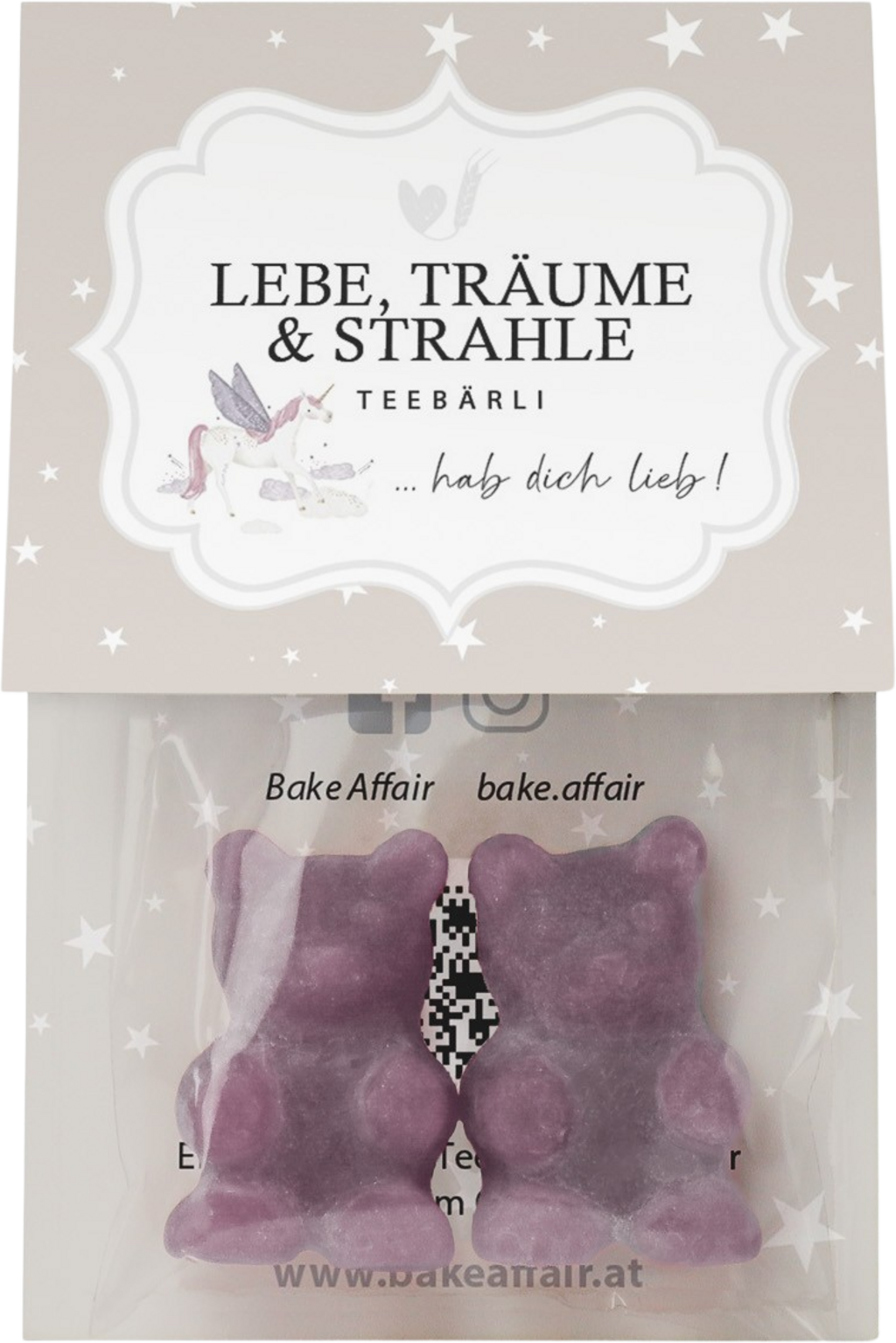 Dessa unika Teebärli från Bake Affair med yoghurt- och blåbärssmak är en favorit hos både stora och små. "Lebe, Träume & Strahle"-varianten passar perfekt som en omtänksam present till någon du tycker om. Förpackningen är dessutom märkt med texten "Jag tycker om dig".