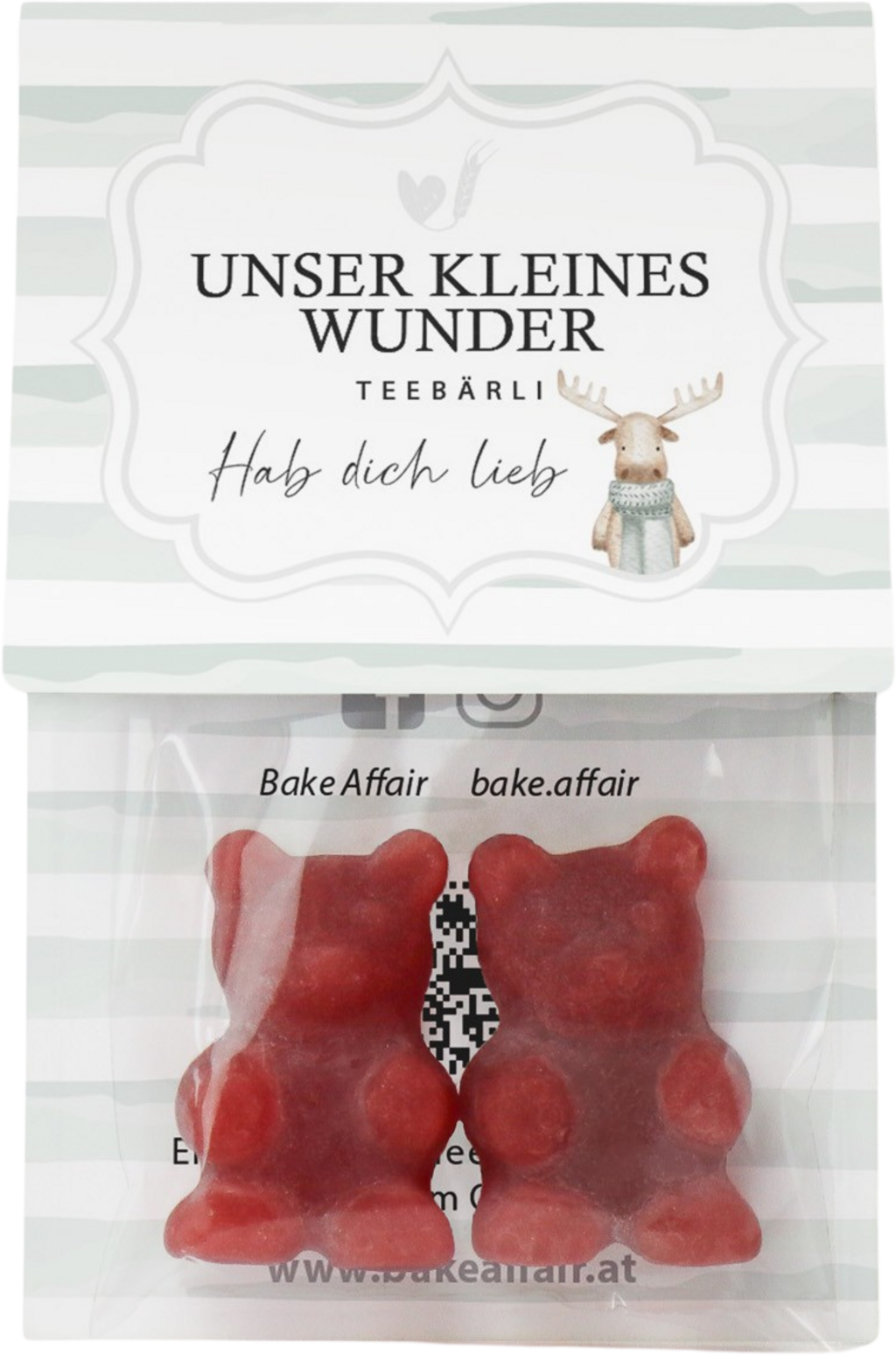 "Unser kleines Wunder" Teebärli är en underbar present till någon du håller kär. Förpackningen bär texten "Hab dich lieb" och när de löses upp i varmt vatten blir det till ett fruktigt te med söt jordgubbssmak. De kan såklart också ätas som de är – precis som du vill.