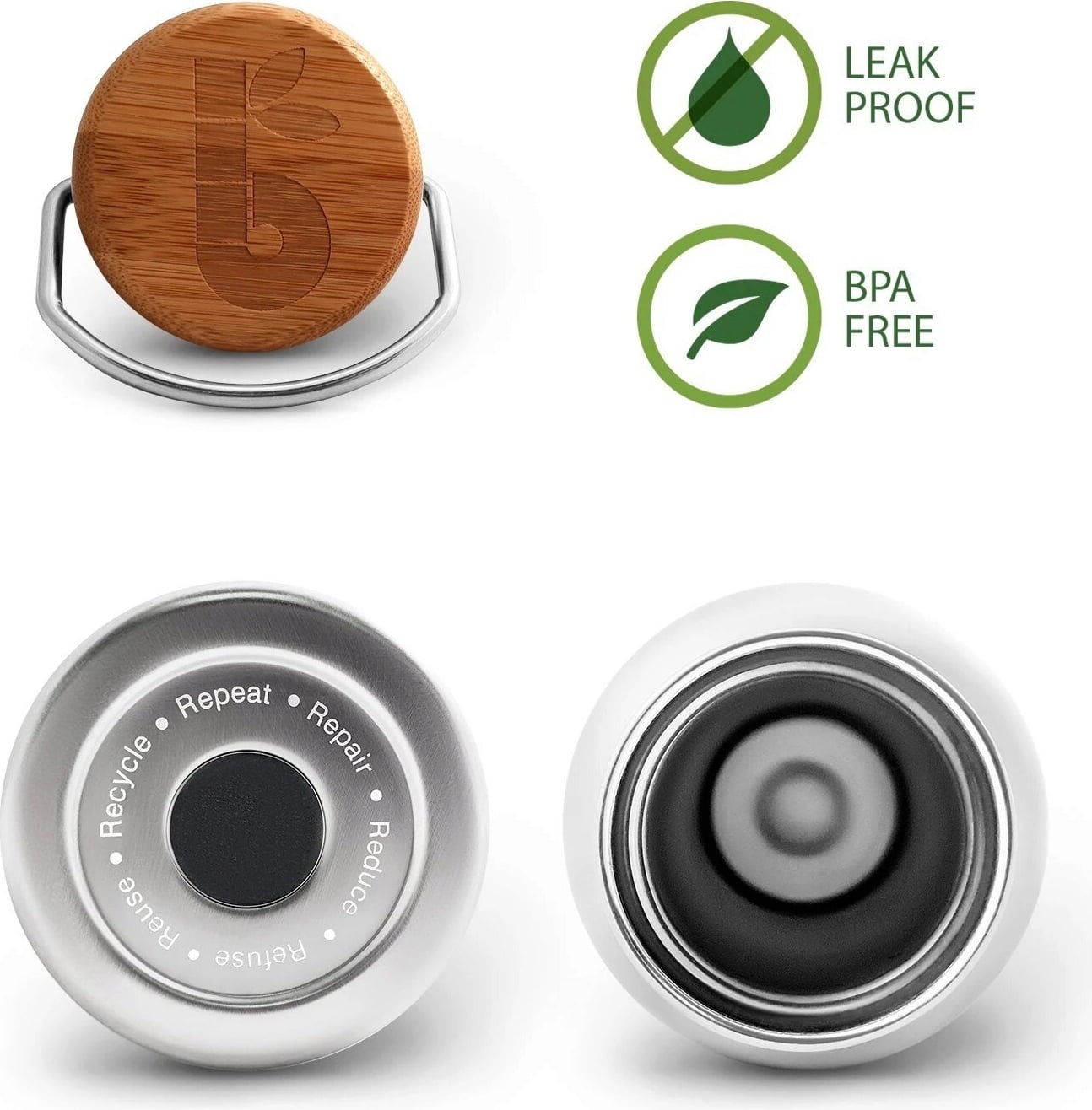 Denna termosflaska i rostfritt stål är den perfekta följeslagaren för hela året. På varma sommardagar håller flaskan drycker kalla upp till 24 timmar. På vinter håller sig drycker varma upp till 12 timmar. Flaskan har ett bambulock. Öppningen är tillräckligt stor för att isbitar, tetång eller frukt ska passa in. När flaskan är tom kan den enkelt rengöras med en flaskborste. Flaskan är BPA-fri. Så kommer inga giftiga kemikalier in i dina drycker.