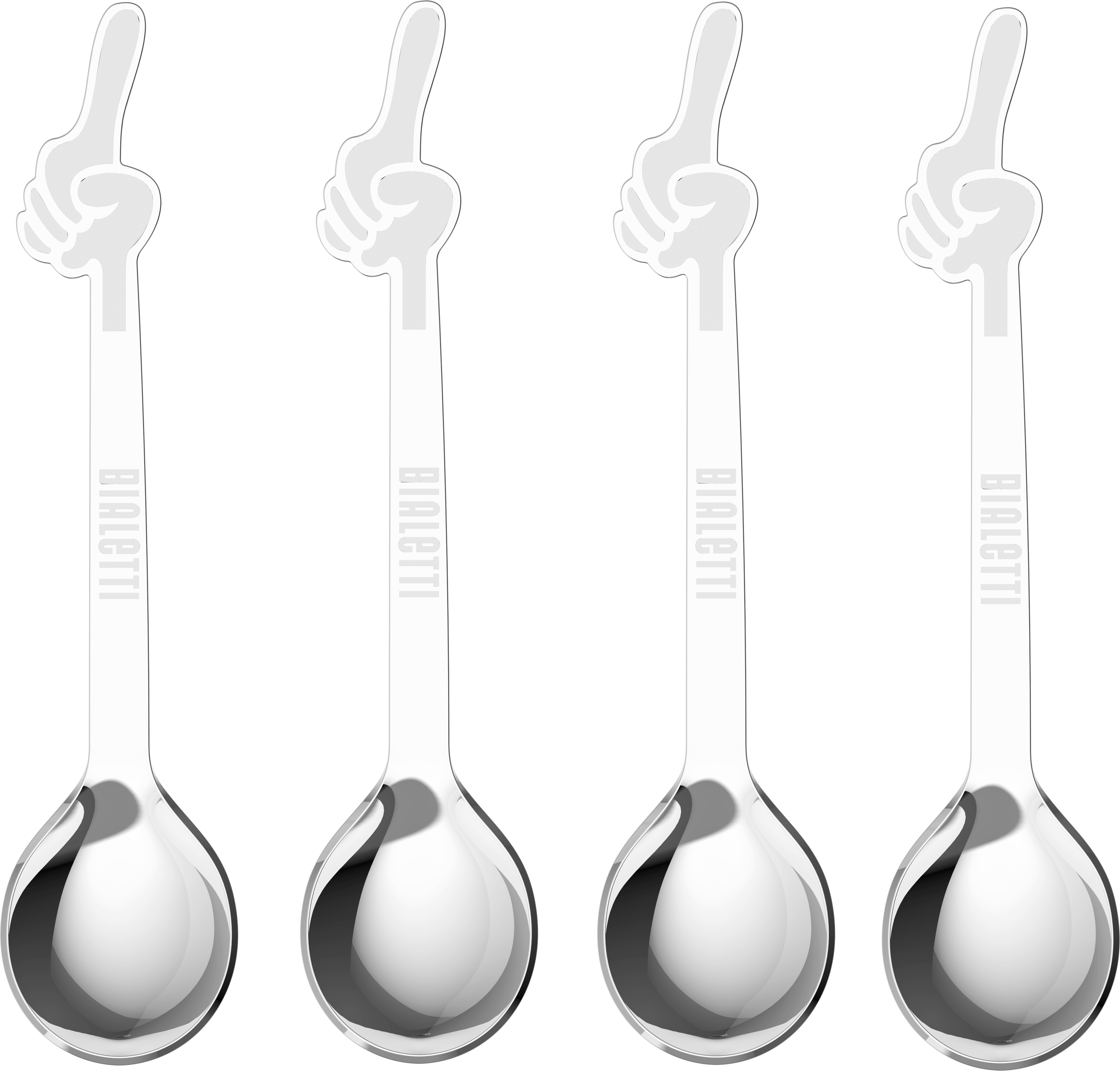 Extravagant design möter Bialettis tradition. Det 4-delade espressoskedsetet med Bialetti-mannens berömda pekfinger är inte bara en fantastisk presentidé, utan också en absolut höjdpunkt i din egen besticklåda.