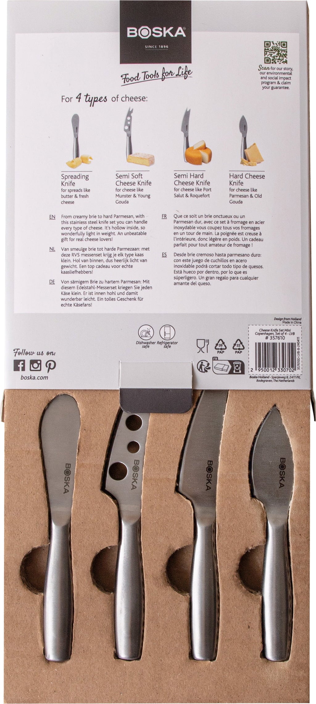 Oavsett om det är krämig mjukost, kraftfull hårdost eller delikata röror – med detta ostknivset är du väl rustad! Det 4-delade setet i rostfritt stål förenar funktionalitet med elegant design. Varje kniv har sin specifika funktion – tillsammans bildar de ett oslagbart team på ostbrickan. Tack vare de lätta, ihåliga handtagen ligger knivarna skönt i handen och tål maskindisk.