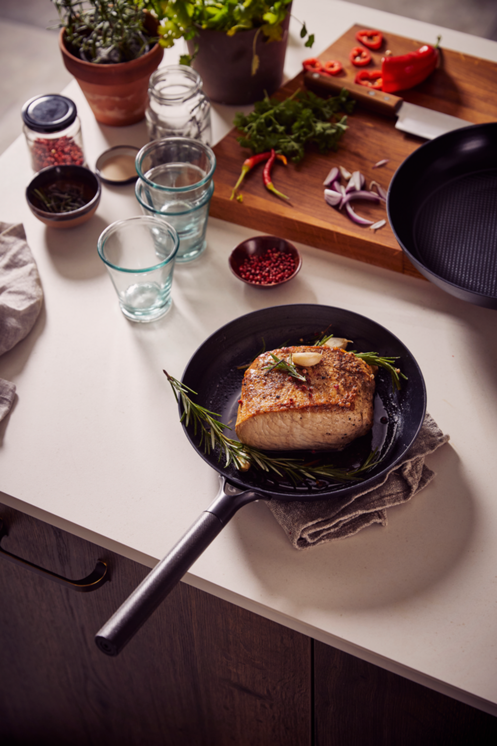 Brabantia Patron-stekpannan har allt du behöver för hälsosam, fettsnål stekning: en PFAS-fri non-stickbeläggning, slitstarkt material av 100 % återvunnet pressjärn och en stilren, funktionell design. Den strukturerade keramiska insidan ger jämn värmefördelning – utan att maten fastnar.