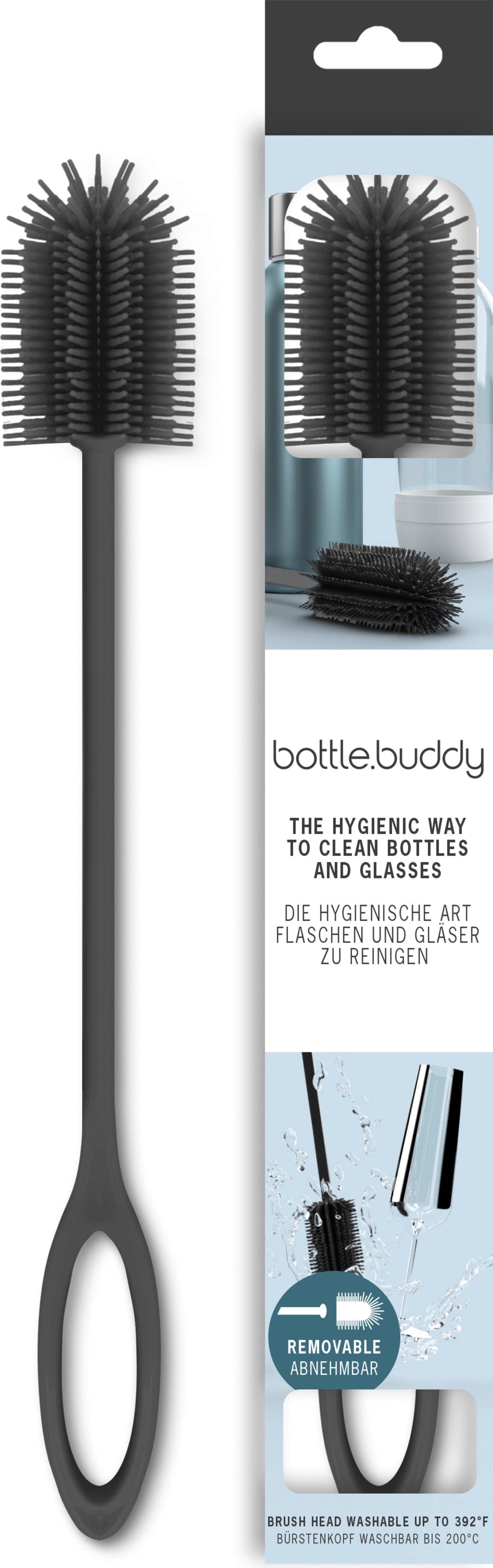 Glöm tidskrävande skrubbande och svåråtkomliga hörn i dina dricksflaskor. Med bottle.buddy rengör du glas, rostfritt stål och känsliga termosmuggar både noggrant och skonsamt. Med en längd på hela 35 cm når denna smarta hjälpreda enkelt varje vrå, medan nästan 500 mjuka borst av livsmedelsgodkänd silikon rengör även känsliga ytor effektivt.