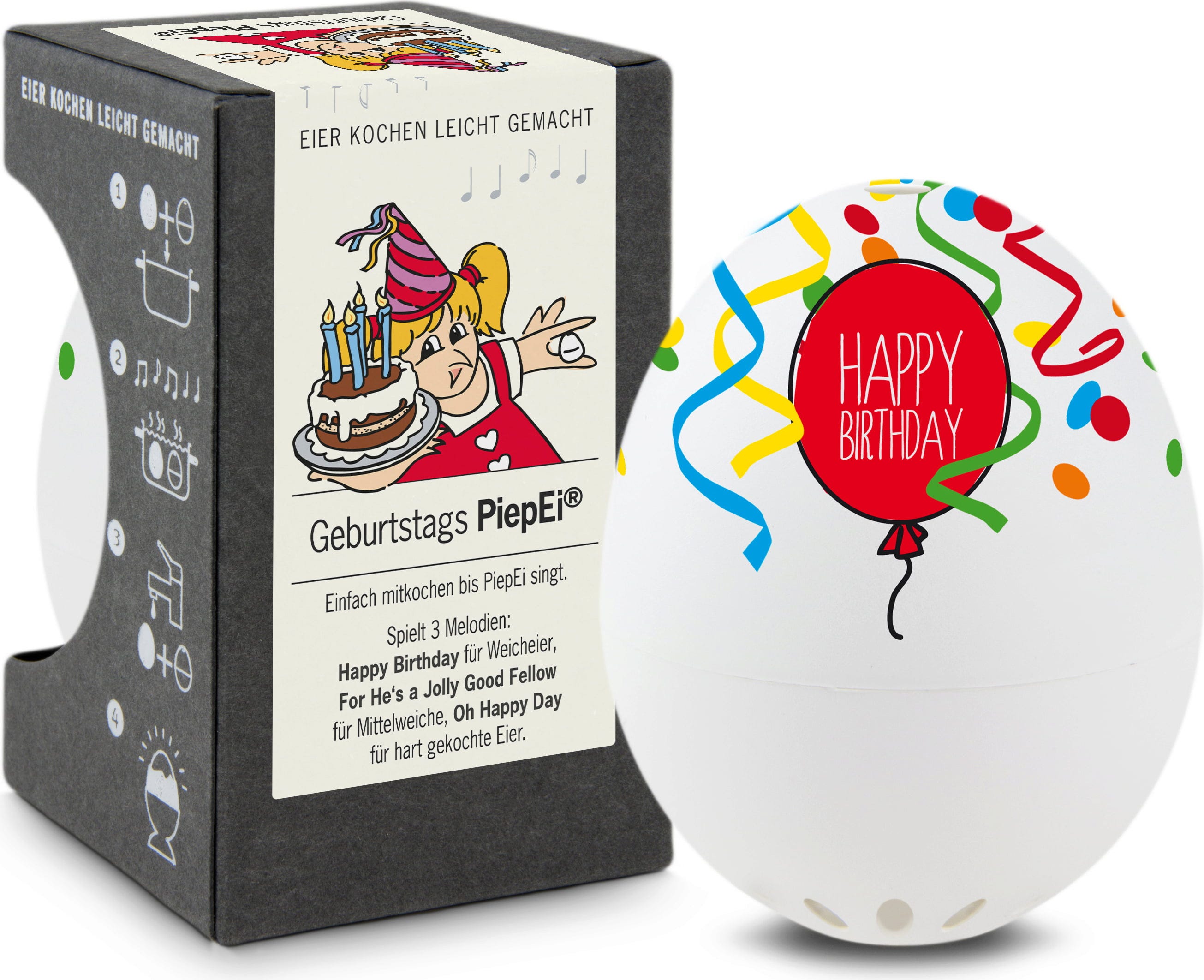 Lägg helt enkelt Geburtstags PiepEi tillsammans med äggen, koka dem ihop och vänta tills melodin för önskad hårdhetsgrad spelas. Oavsett starttemperatur på vattnet, äggstorlek eller höjd över havet.