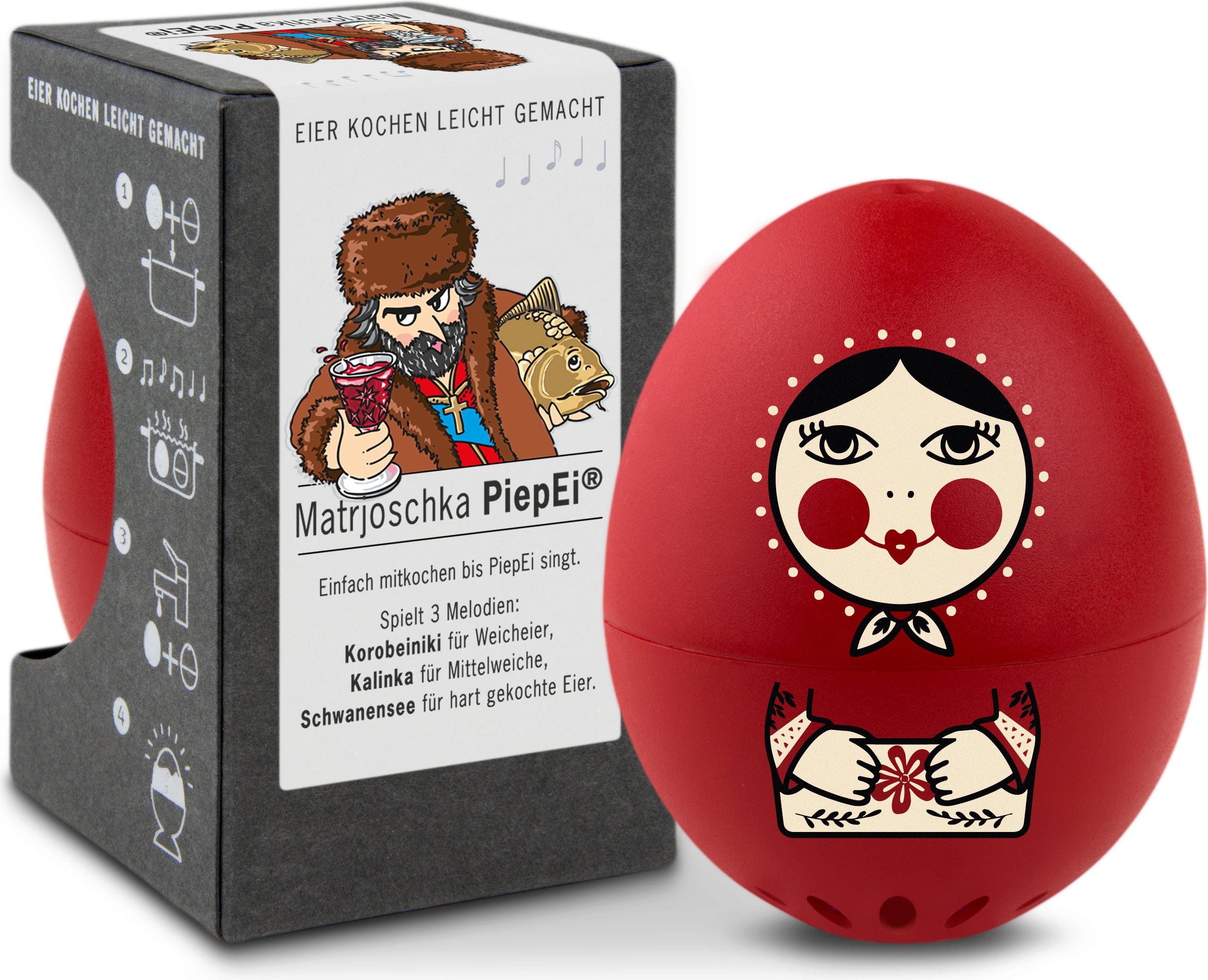 Lägg helt enkelt Matrjoschka PiepEi tillsammans med äggen, koka dem ihop och vänta tills melodin för önskad hårdhetsgrad spelas. Oavsett starttemperatur på vattnet, äggstorlek eller höjd över havet.