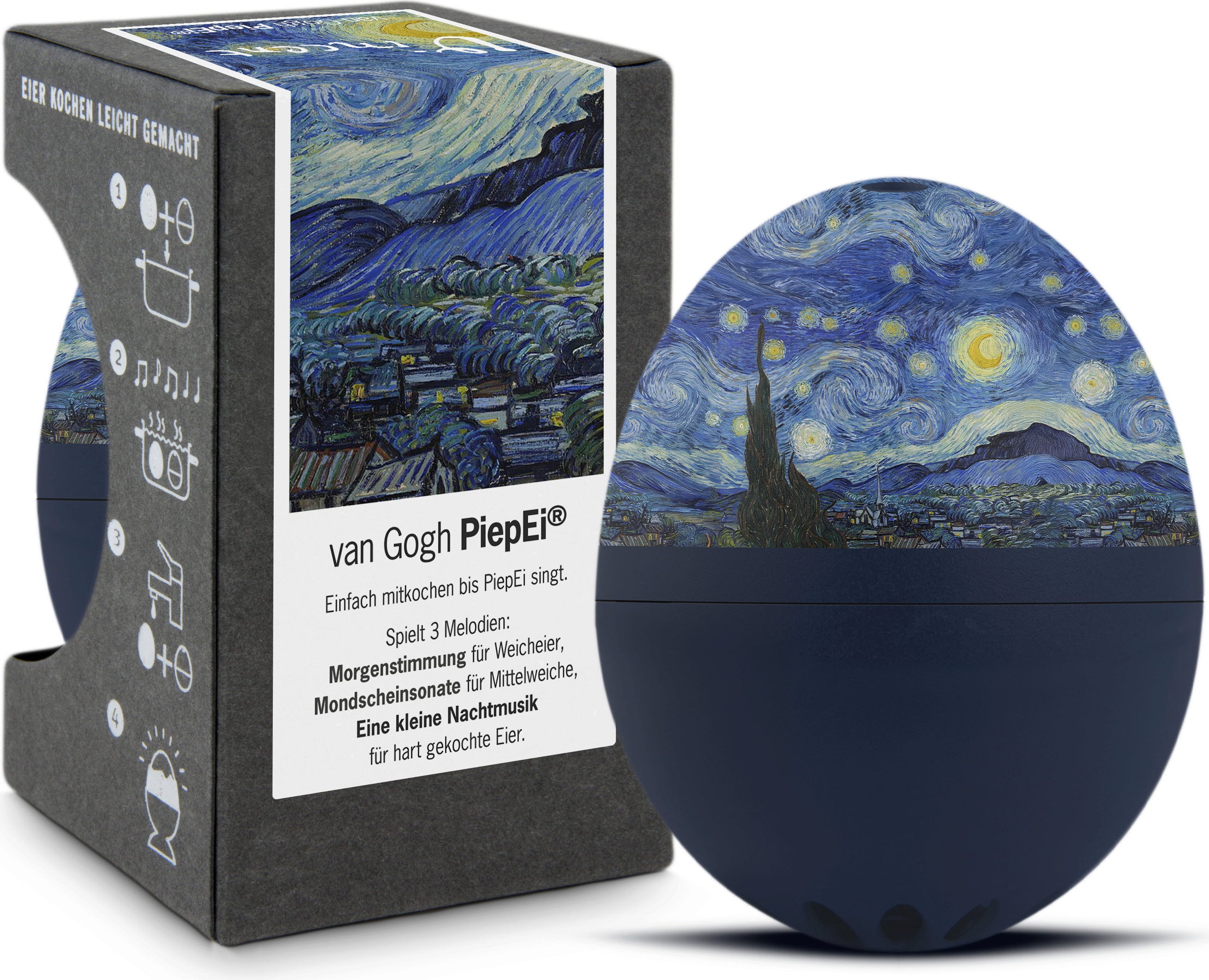 Lägg helt enkelt van Gogh PiepEi tillsammans med äggen, koka dem ihop och vänta tills melodin för önskad hårdhetsgrad spelas. Oavsett starttemperatur på vattnet, äggstorlek eller höjd över havet.