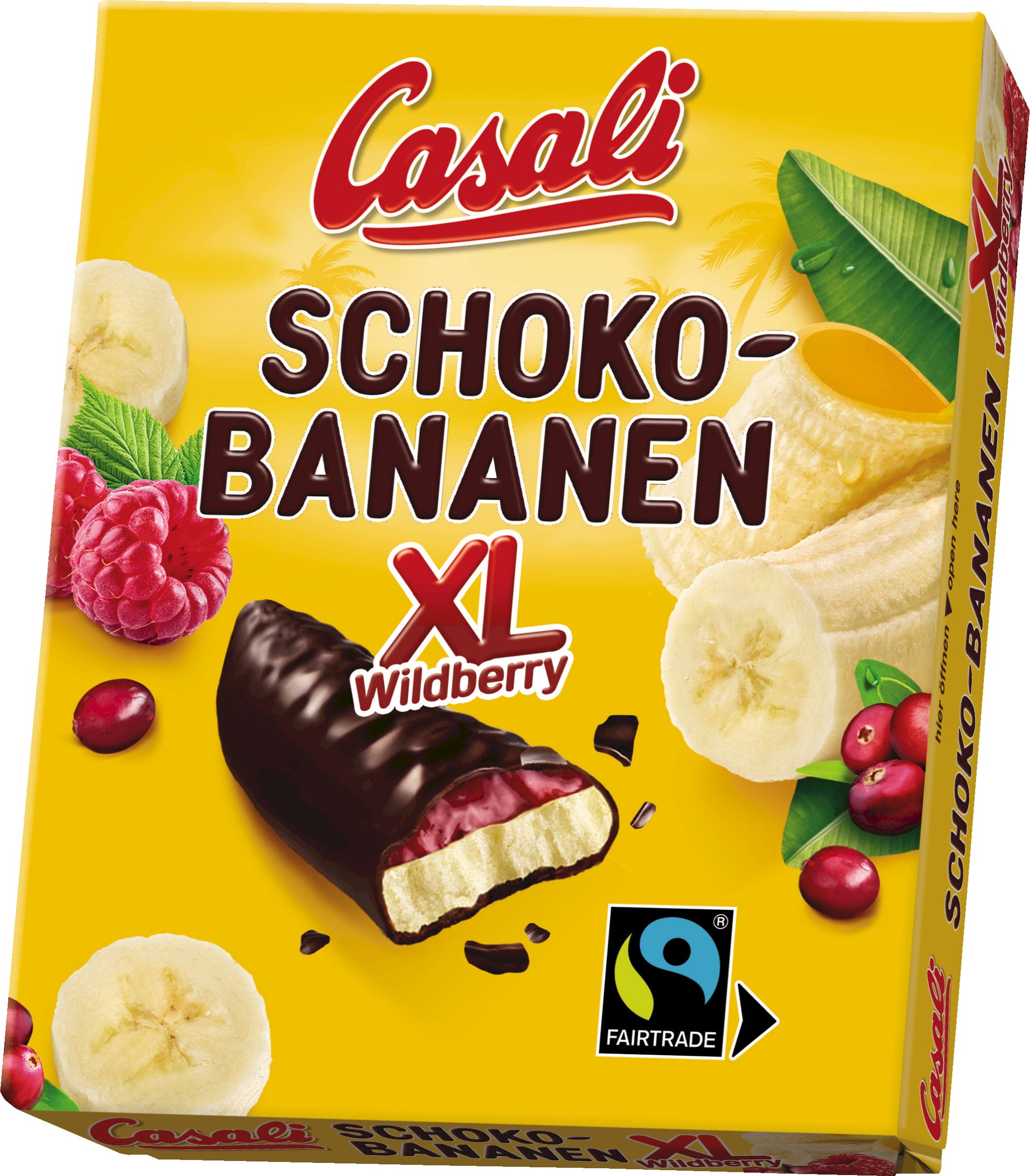 Vem i Österrike känner inte till dem, de berömda chokladbananerna från Casali? Oavsett om de är stora eller små är den fruktiga sötsaken mycket populär i hela landet. Chokladbananer XL Wildberry är ännu mer fruktiga, för här möter den välkända fyllningen av Chiquita-bananer exotiska Wildberry. Det hela täcks av ett lager krispig choklad med kakao från det egna rosteriet. Resultatet är en fruktig godbit av choklad, banan, hallon och tranbär som helt enkelt ingen kan motstå.