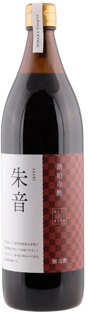Den japanska Mikura Sakekasu - röd risvinäger "Akane", som fermenterats länge i träfat, tillverkas i prefekturen Mie och har lagrats i över 3 år i träfat. Den rika och komplexa aromen med toner av umami och lagrat ris beror på den långa lagringstiden. Passar perfekt till sushi, dressingar, marinader, pickles och även till hemmagjord ketchup eller tomatsåser.