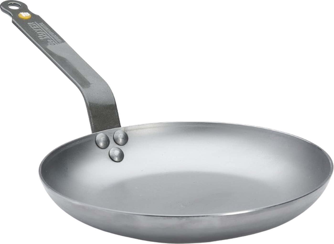 Pannan är tillverkad av högkvalitativt stål och har en bivaxbeläggning som skyddar mot oxidation och gör det enkelt att bränna in ytan. Det nitade, klassiskt franska handtaget är elegant böjt för ett säkert grepp och bekväm hantering vid spisen.
