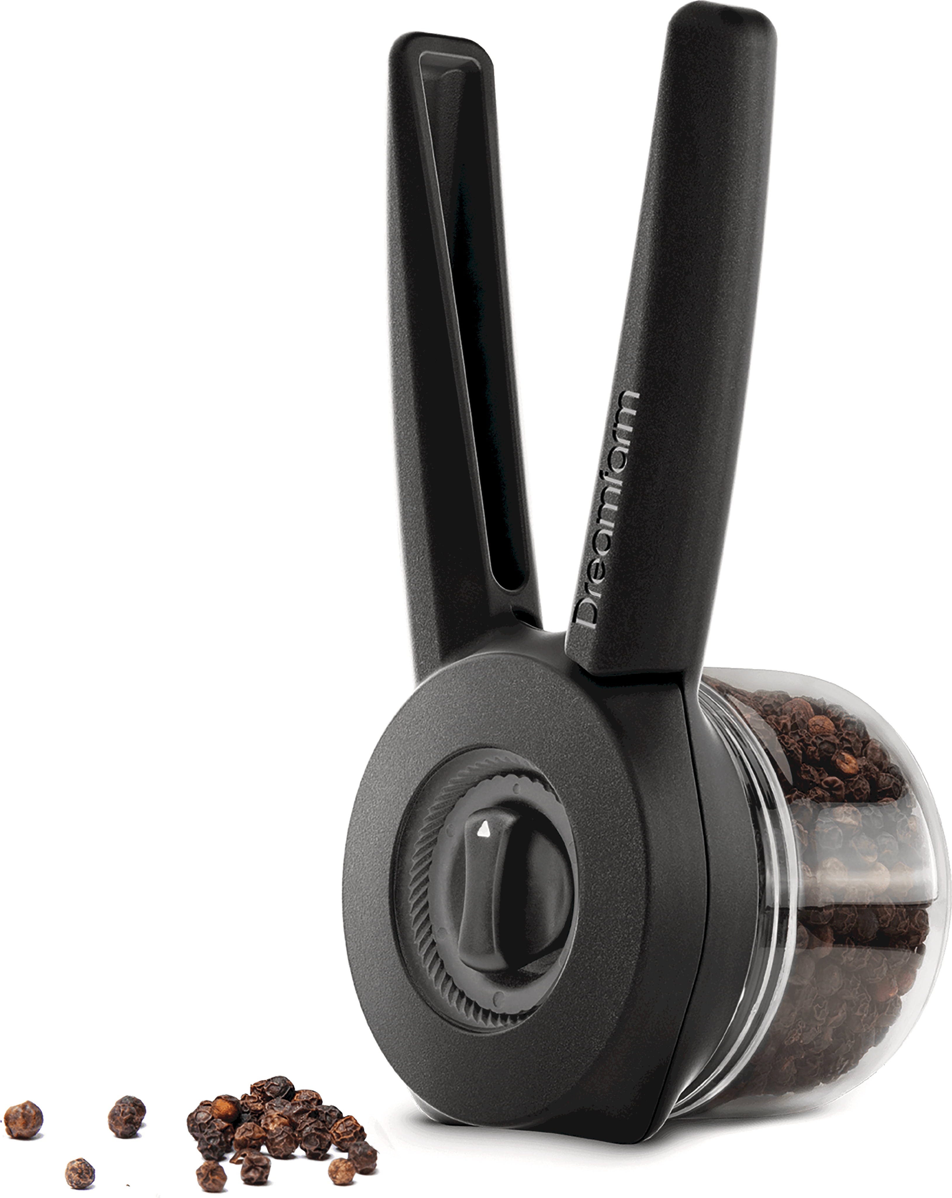 Kryddkvarnen Ortwo Lite från Dreamfarm är världens första kvarn som kombinerar bekväm enhandsanvändning med hastigheten och kapaciteten hos tvåhandsmalning. Det ultras vassa keramiska malverket kan ställas in i 6 steg från extra fint till grovt, rostar aldrig och passar perfekt för alla kryddor - även salt.
