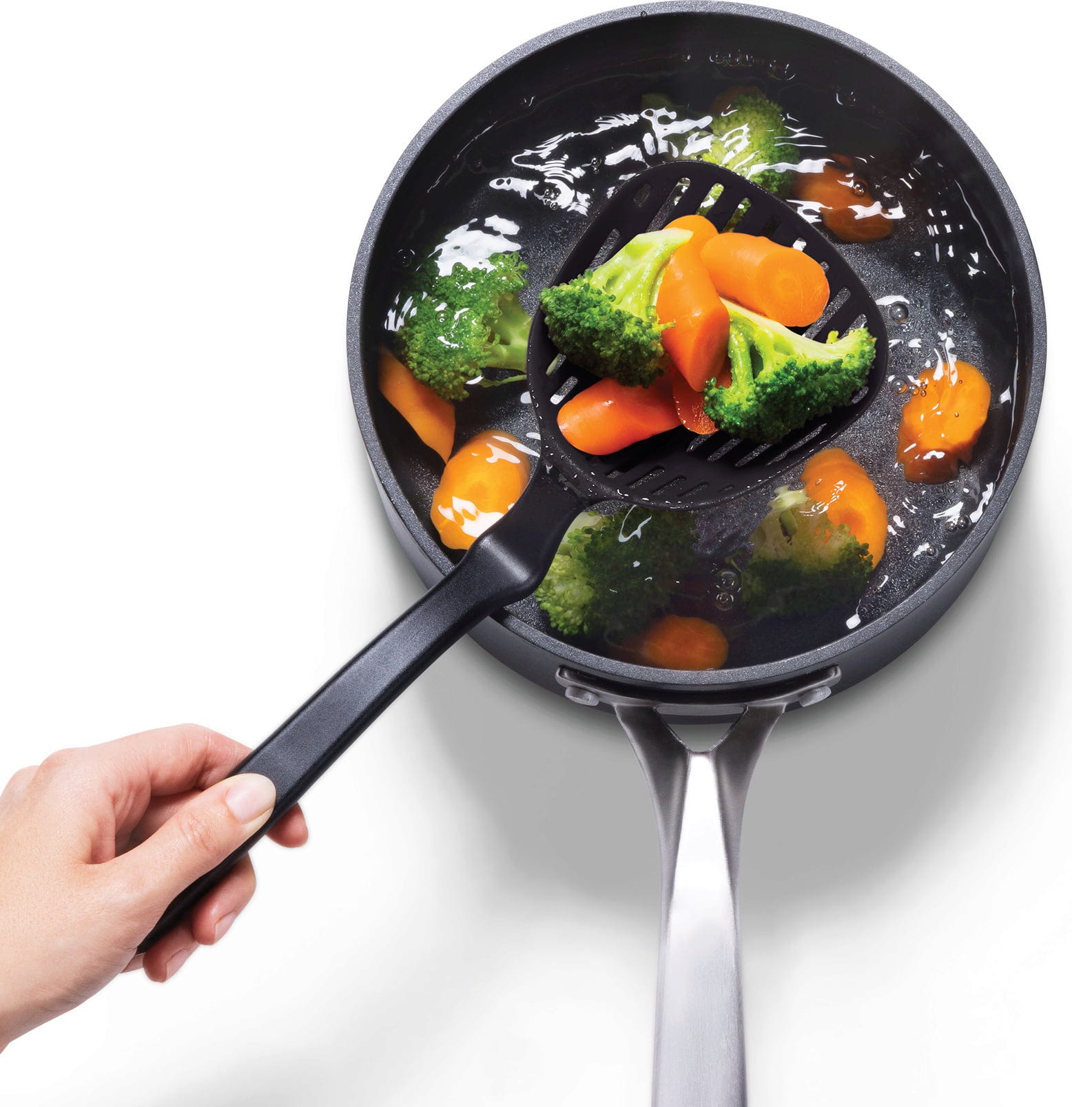 Tack vare det innovativa handtaget med böj svävar skedhuvudet över ytan så att du kan lägga ner det rent utan direktkontakt med arbetsbänken. Det ergonomiska greppet gör denna slitstarka nylonhjälp till en perfekt partner för effektiv matlagning.