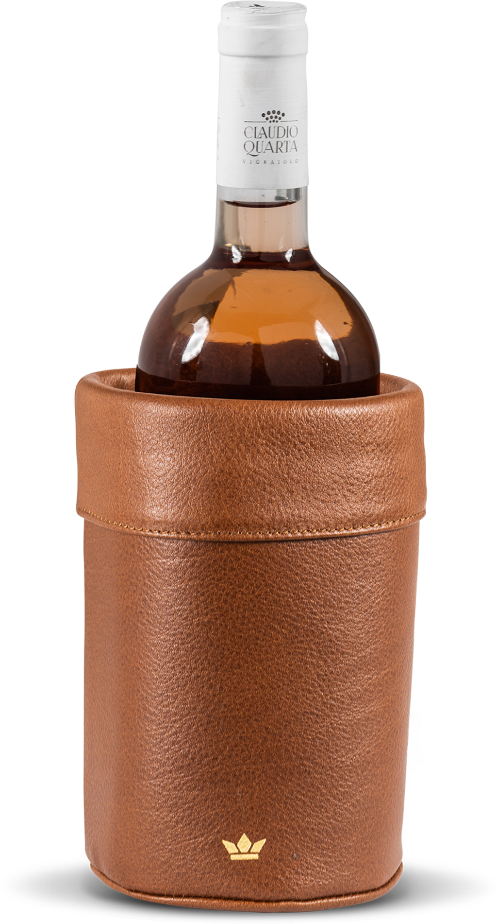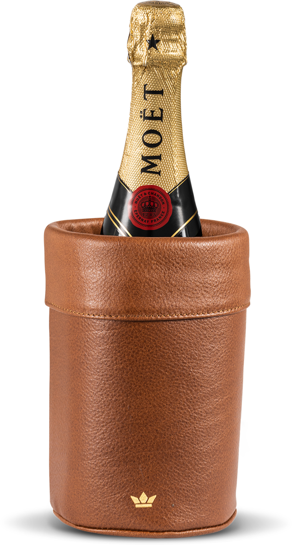 Denna snygga vin- och champagnekylare gjord av högkvalitativt fullnarvsläder drar till sig allas uppmärksamhet. Perfekt för ditt eget hem, men också underbar som present.