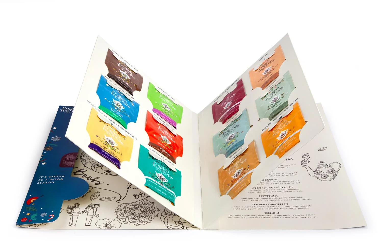 Det speciella med denna adventskalender är dess form, som kan bläddras igenom som en bok och innehåller 24 ekologiska teer och andra extrafunktioner på flera sidor. Bland teblandningarna finns även speciella vinter- och julteer som sprider en förjulsstämning och uppmuntrar dig att pausa och njuta.