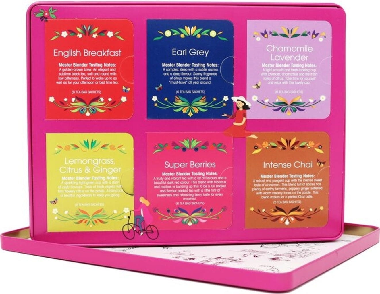 Varje sort innehåller 6 påsar - perfekt för att prova, dela och jämföra! Den stilfulla presentboxen i präglad metall håller ordning i teköket och kan fyllas på igen. Totalt ingår 36 tepåsar.