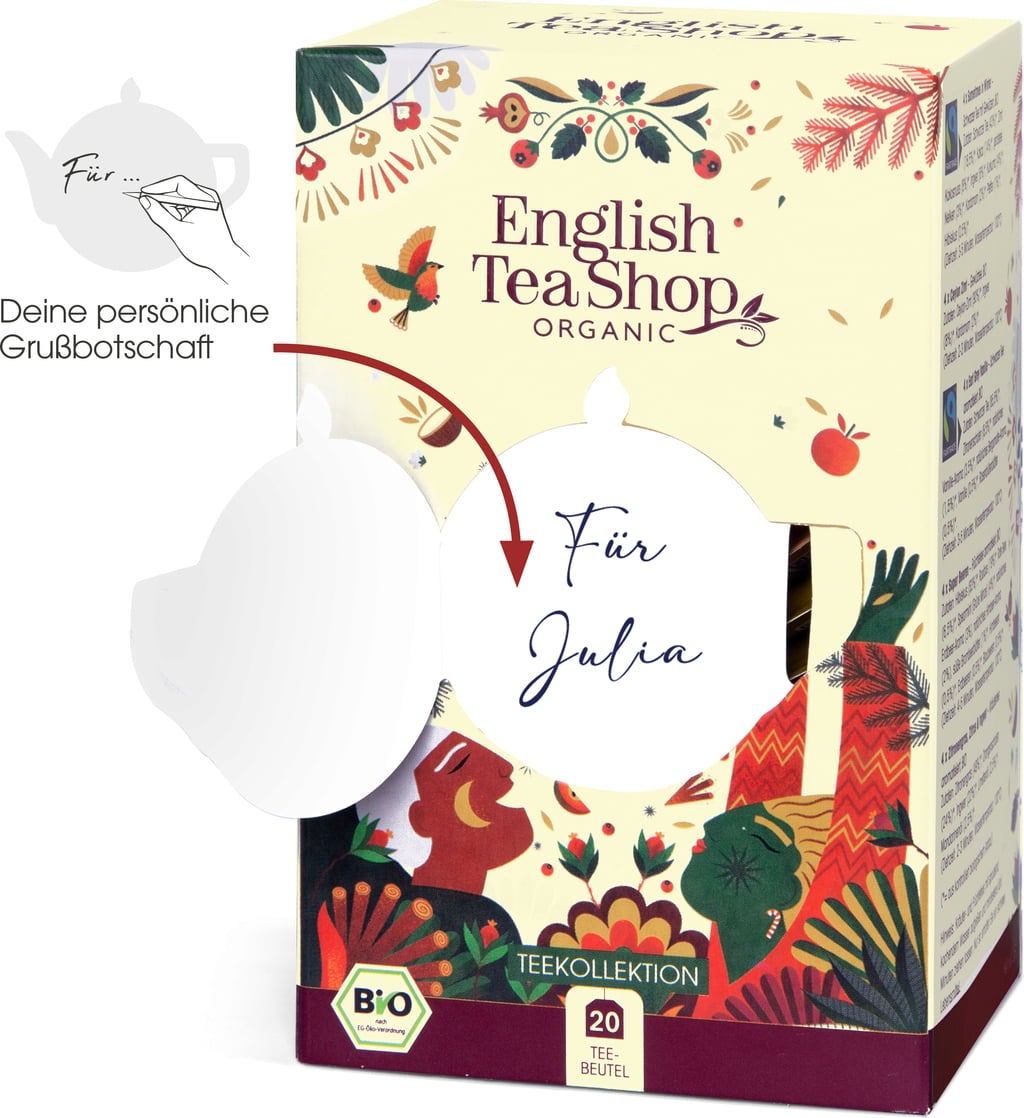 Denna anpassningsbara tegåva ger julglädje med 5 olika typer av ekologiskt te. På framsidan av förpackningen finns ett utfällbart gratulationskort som ger plats för ett personligt julbudskap. Ett originellt alternativ till det traditionella julkortet - perfekt för vänner, bekanta och kollegor.