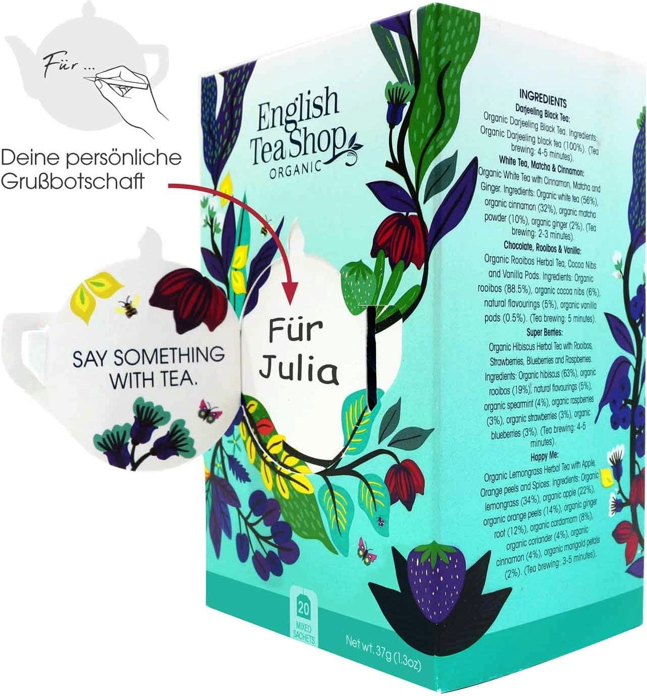 Obs: Totalt innehåller boxen 20 tepåsar, 4 av varje sort - perfekt för att prova i trevligt sällskap! Alla recept är veganska och förpackningen är plastfri.