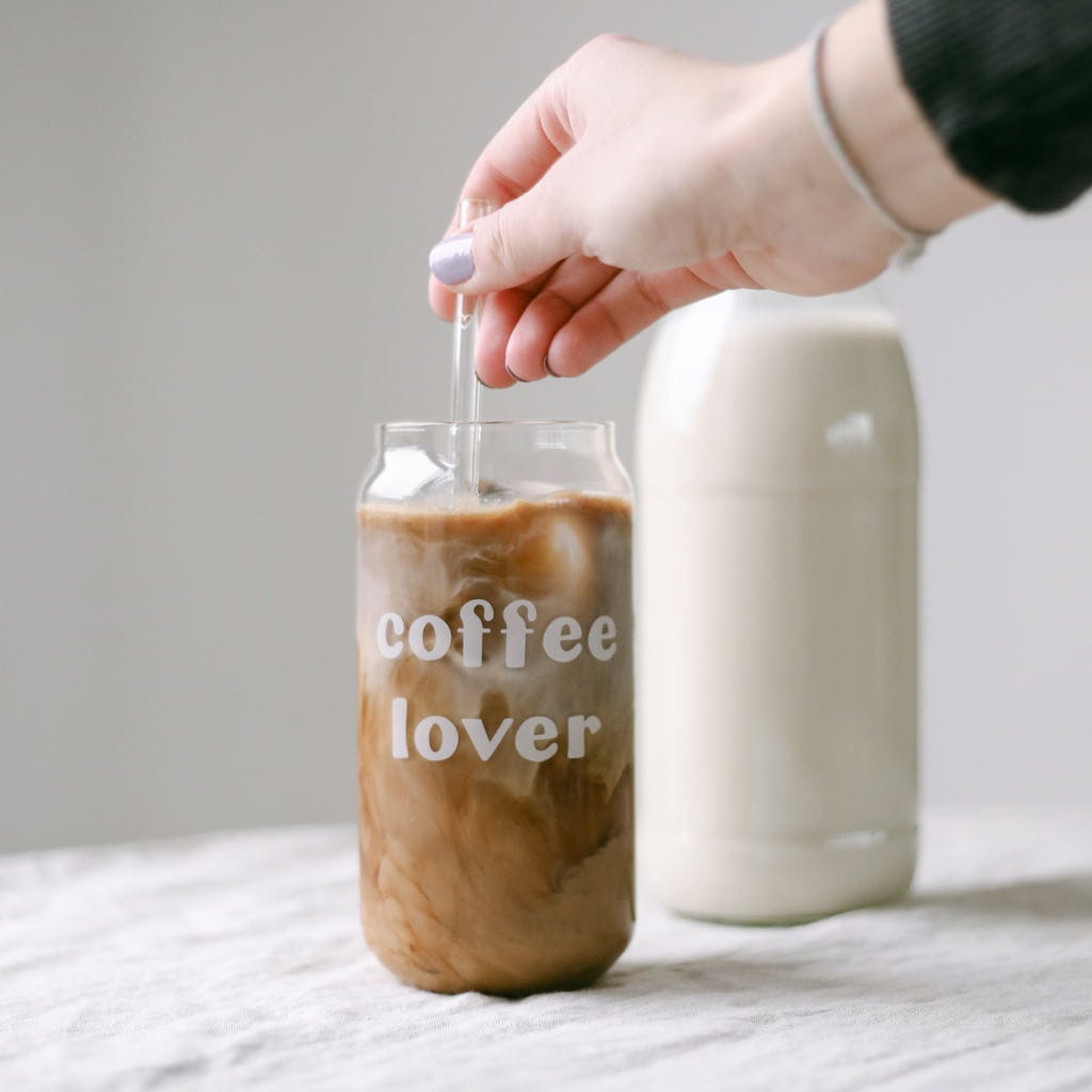 Det höga dricksglaset har en burkform med ett vitt tryck. Ett fantastiskt blickfång för sommardrinkar eller en läcker latte. Dricksglaset är lätt att rengöra i diskmaskinen.