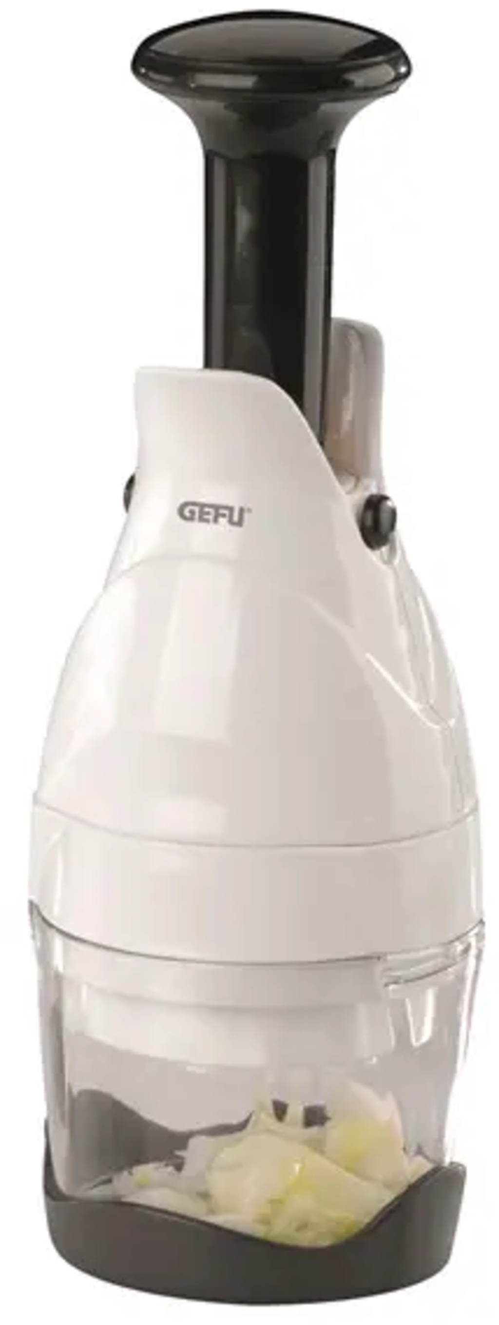 Glöm tårfyllt och mödosamt hackande av lök! Med grönsaks- och örthackaren från GEFU har du alltid en snabb hjälpreda nära till hands. Behöver du finhackad vitlök, persilja eller lök på nolltid, gör du det enkelt med ett tryck på handtaget, och tack vare den halksäkra botten står hackaren stabilt medan du jobbar!