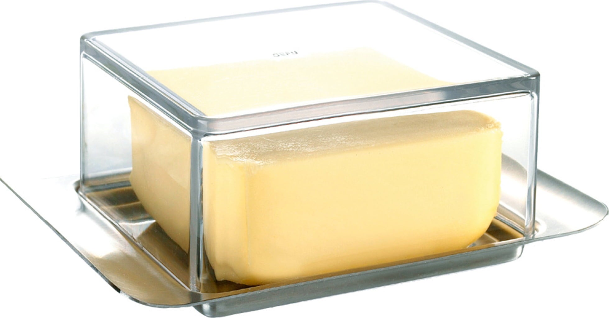 Smörasken BRUNCH är den perfekta detaljen för både frukostbordet och kylskåpet! Den smala underdelen i rostfritt stål passar i de flesta dörrfack i vanliga kylskåp. Det rymliga locket i plast har en elegant glaslook men är mycket tåligare - och tack vare de ergonomiska greppkanterna ligger det stadigt i handen.
