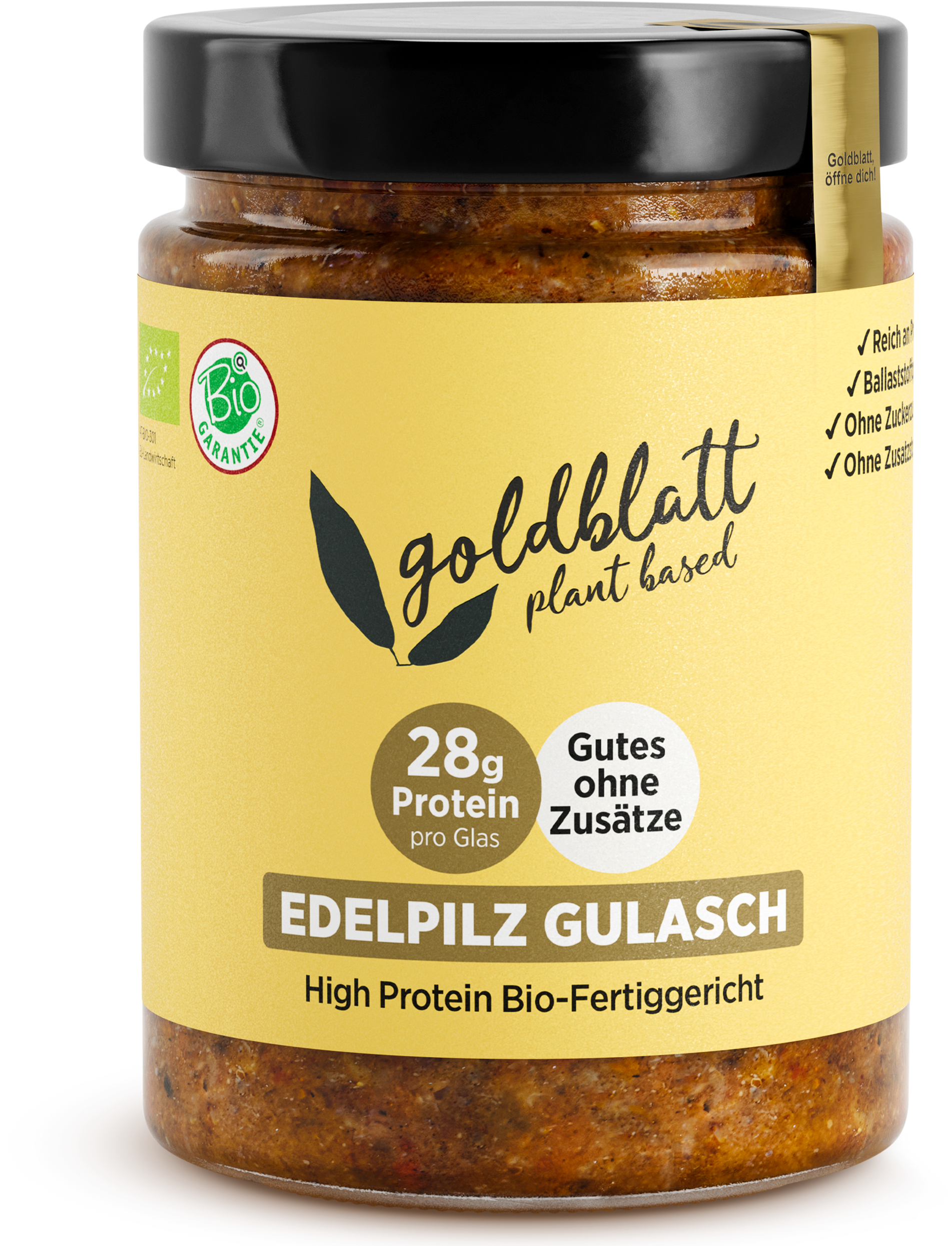 Denna fina svampgulasch från Goldblatt är en bräserad specialitet. Den kombinerar steiriska champinjoner, kryddiga sojastrimlor, intensiv paprikakrydda och rostad lök för att skapa en smakrik och proteinrik godbit.