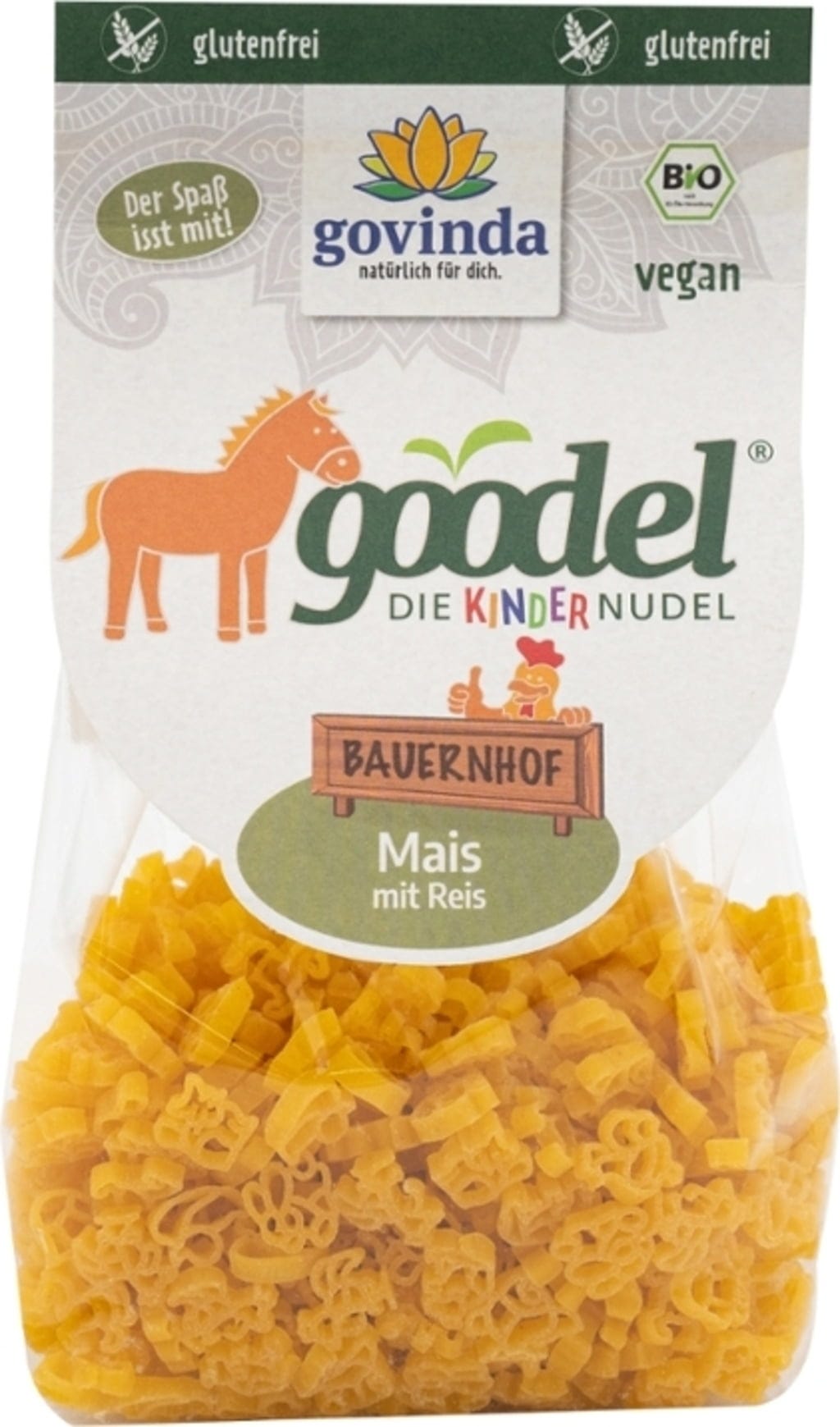 Kinder-Goodel „Bauernhof“ från Govinda kombinerar lek och smak på tallriken. Pastan tillverkas av italiensk majs och ris, formas för hand och torkas varsamt. Den glutenfria recepturen gör den till ett genomtänkt val i en medveten kost. De söta djurformerna och den milda smaken gör den uppskattad hos små matälskare.